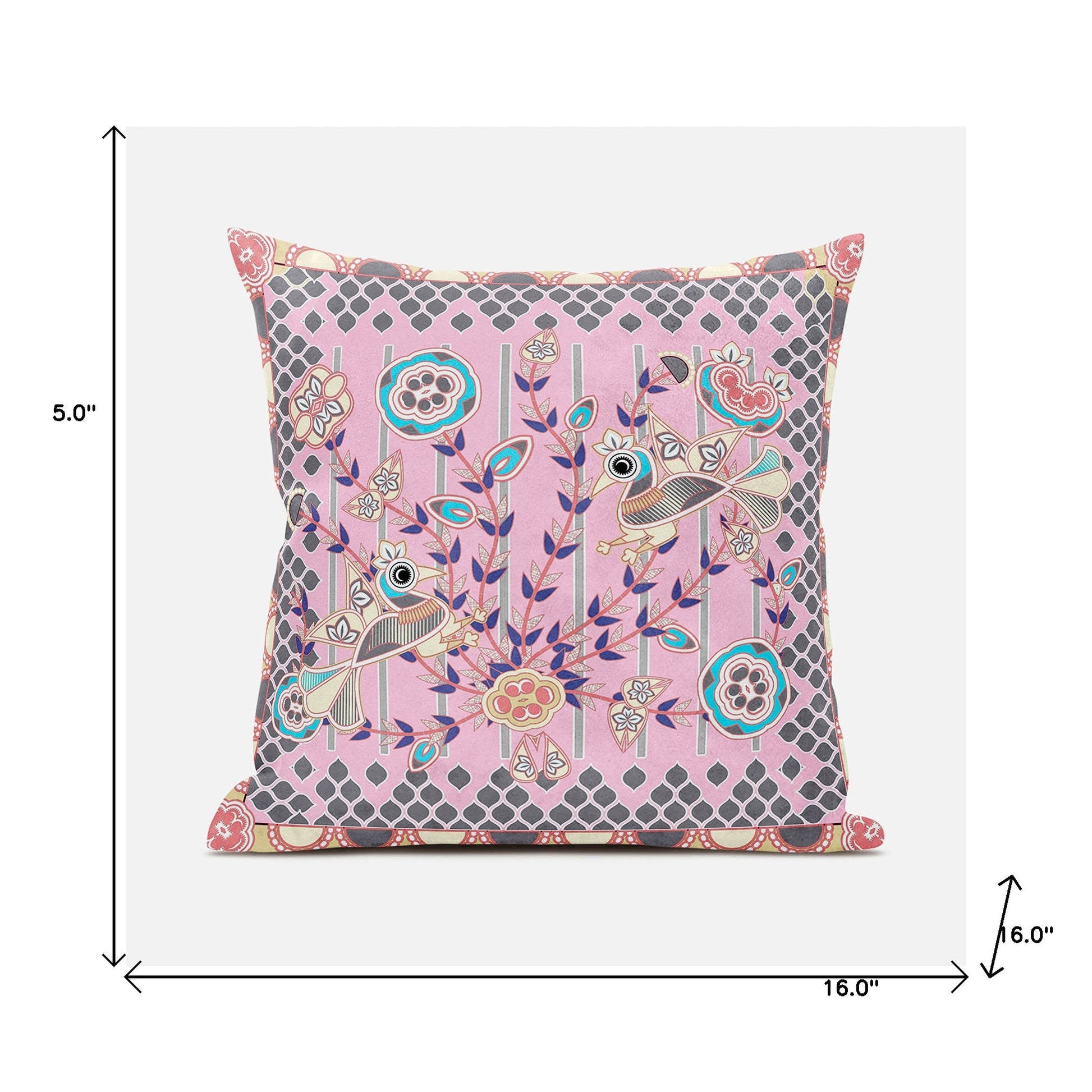 16" X 16" Gray and Pink Peacock Broadcloth Floral Zippered Pillow