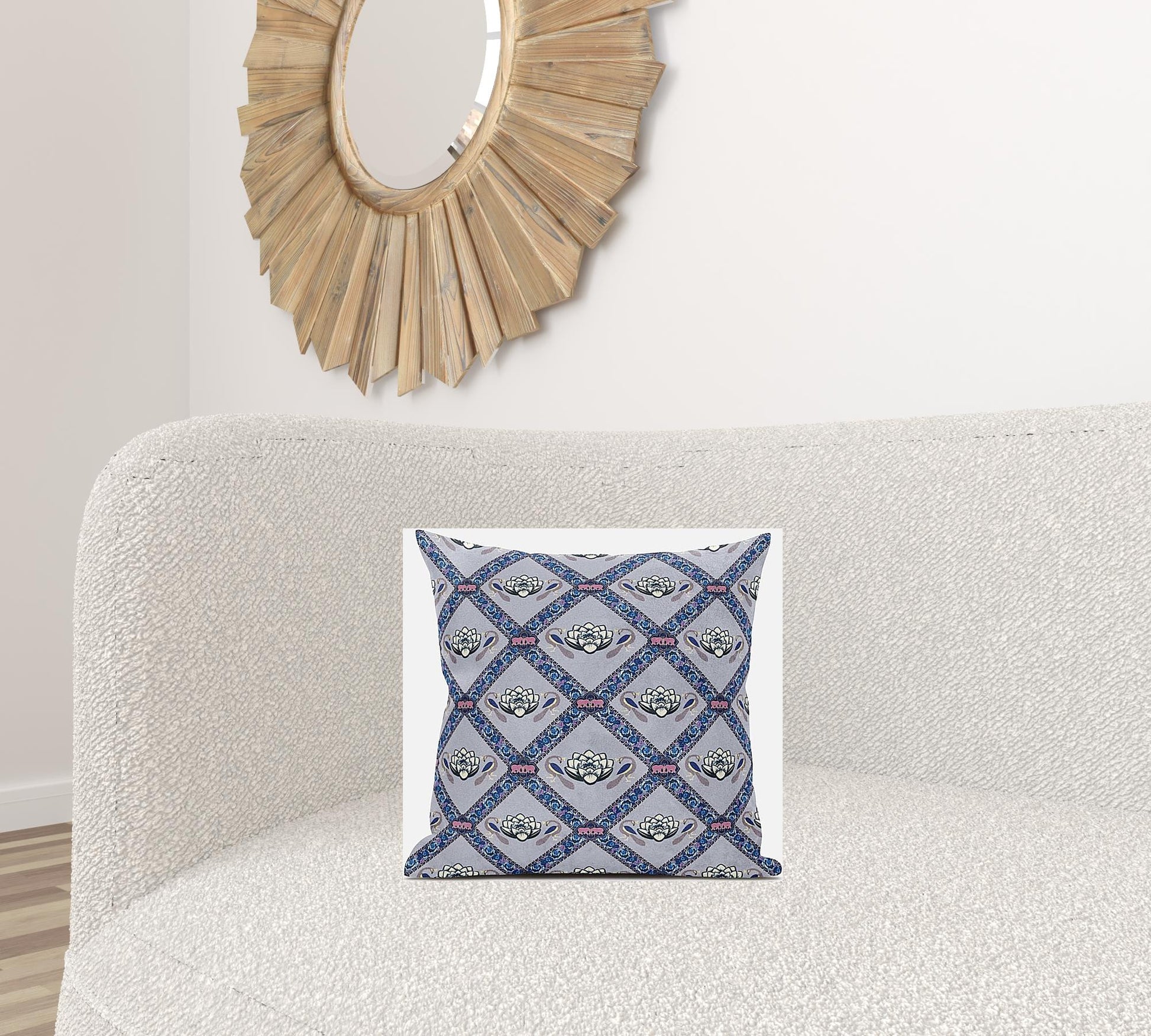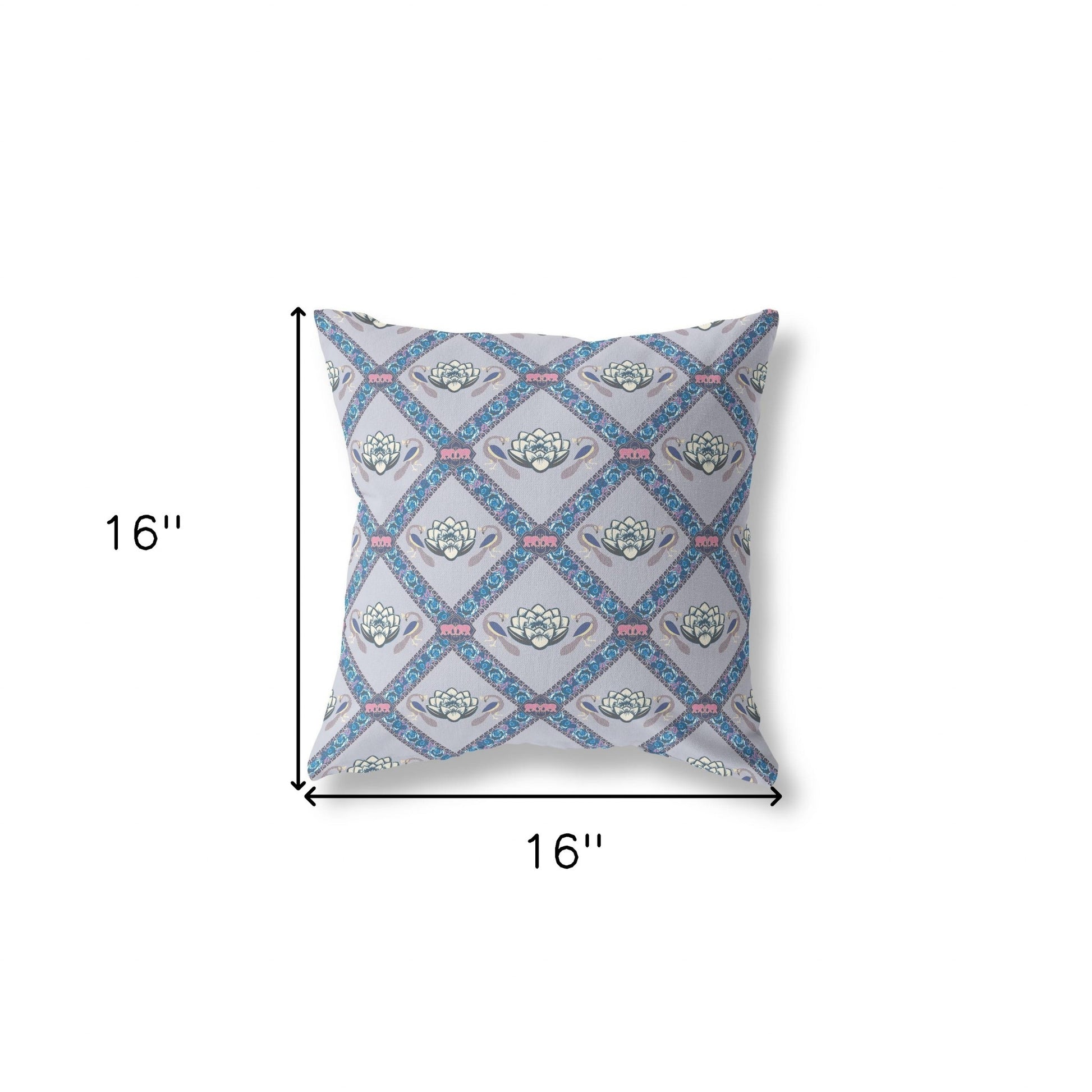 16" X 16" Gray Sea Blue Pink Lotus Floral Blown Seam Suede Throw Pillow