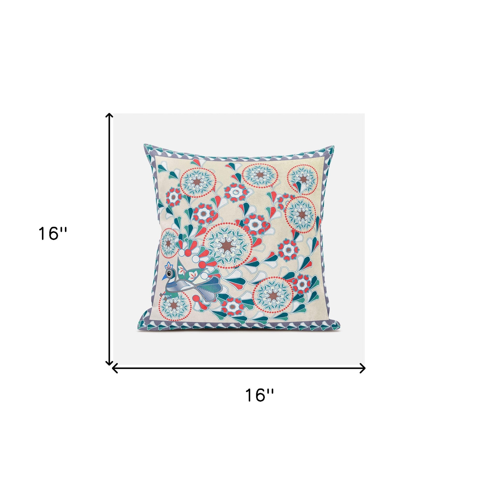 16" X 16" Green and Red Peacock Broadcloth Floral Zippered Pillow