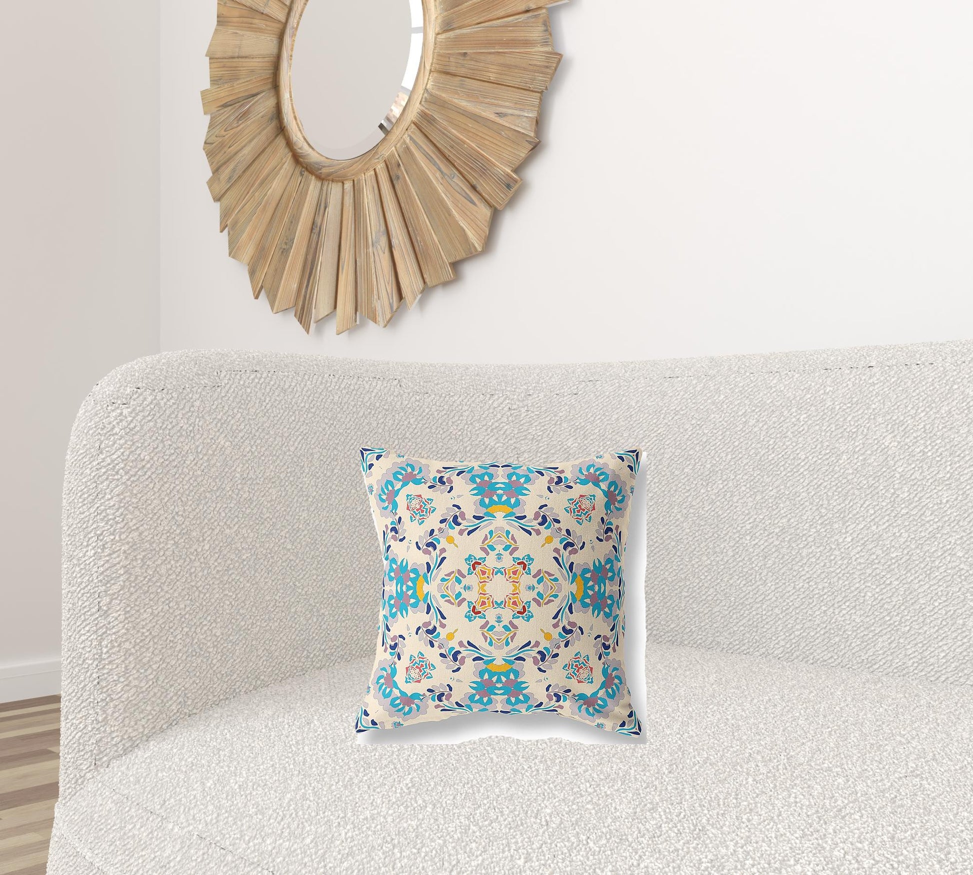 The 16" x 16" off white and blue abstract blown seam suede throw pillow is the perfect decorative accessory for your home. Great to use on its own or mix with other decorations for the perfect look. A great decorative accessory for your favorite chair, to accent your sofa, or to use as part of your bed ensemble. 5" H x 16" W x 16" D