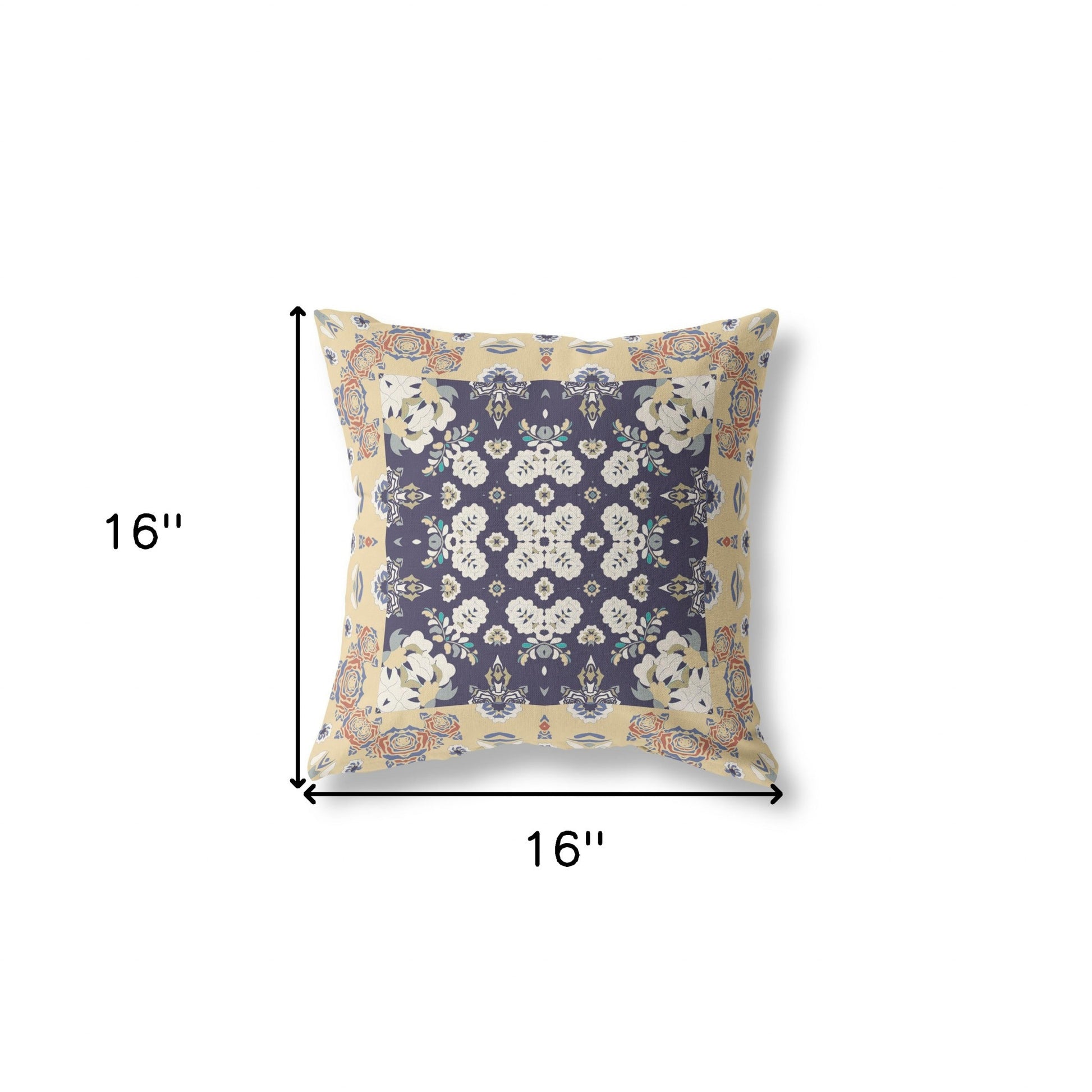 16" X 16" Yellow And Navy Floral Zippered Suede Throw Pillow