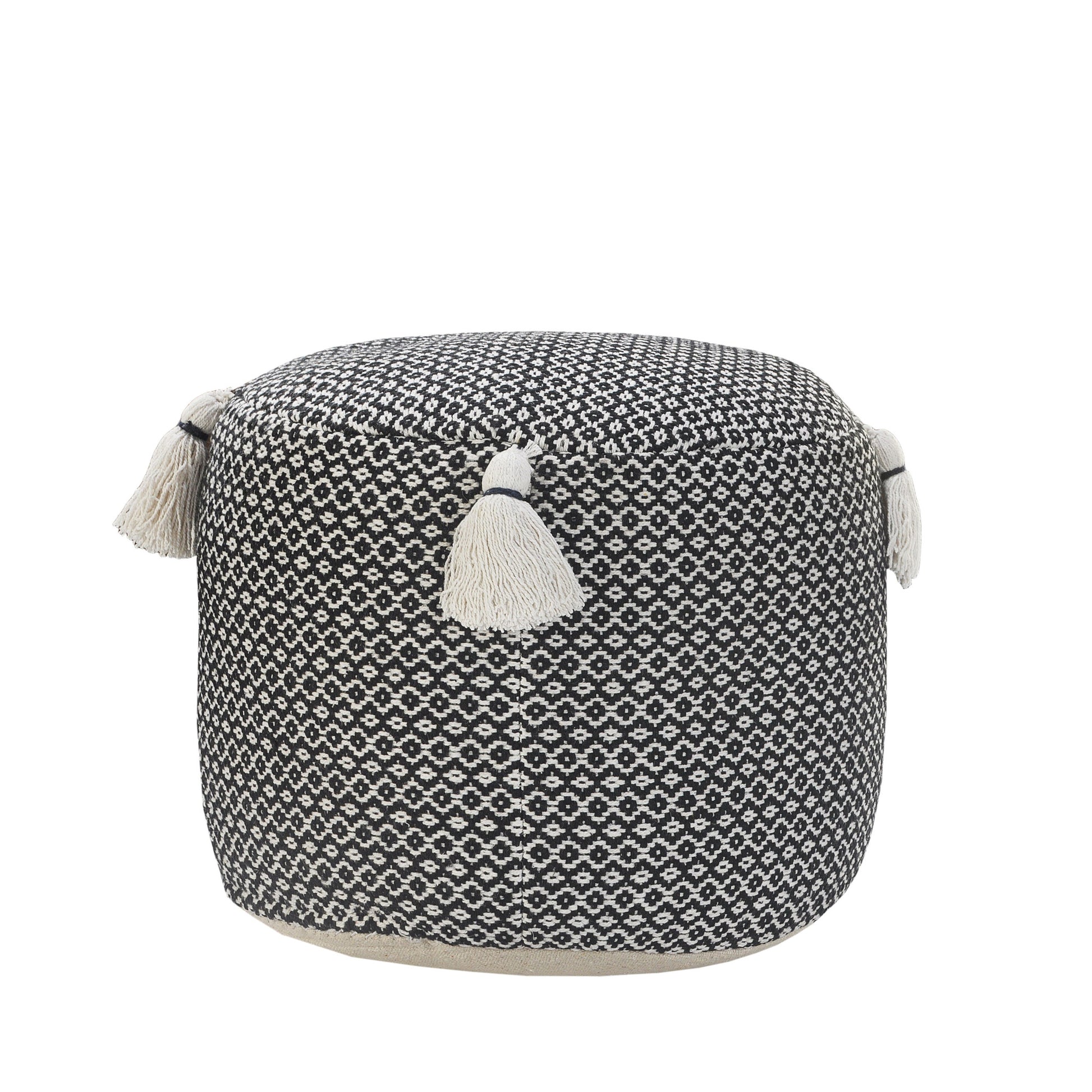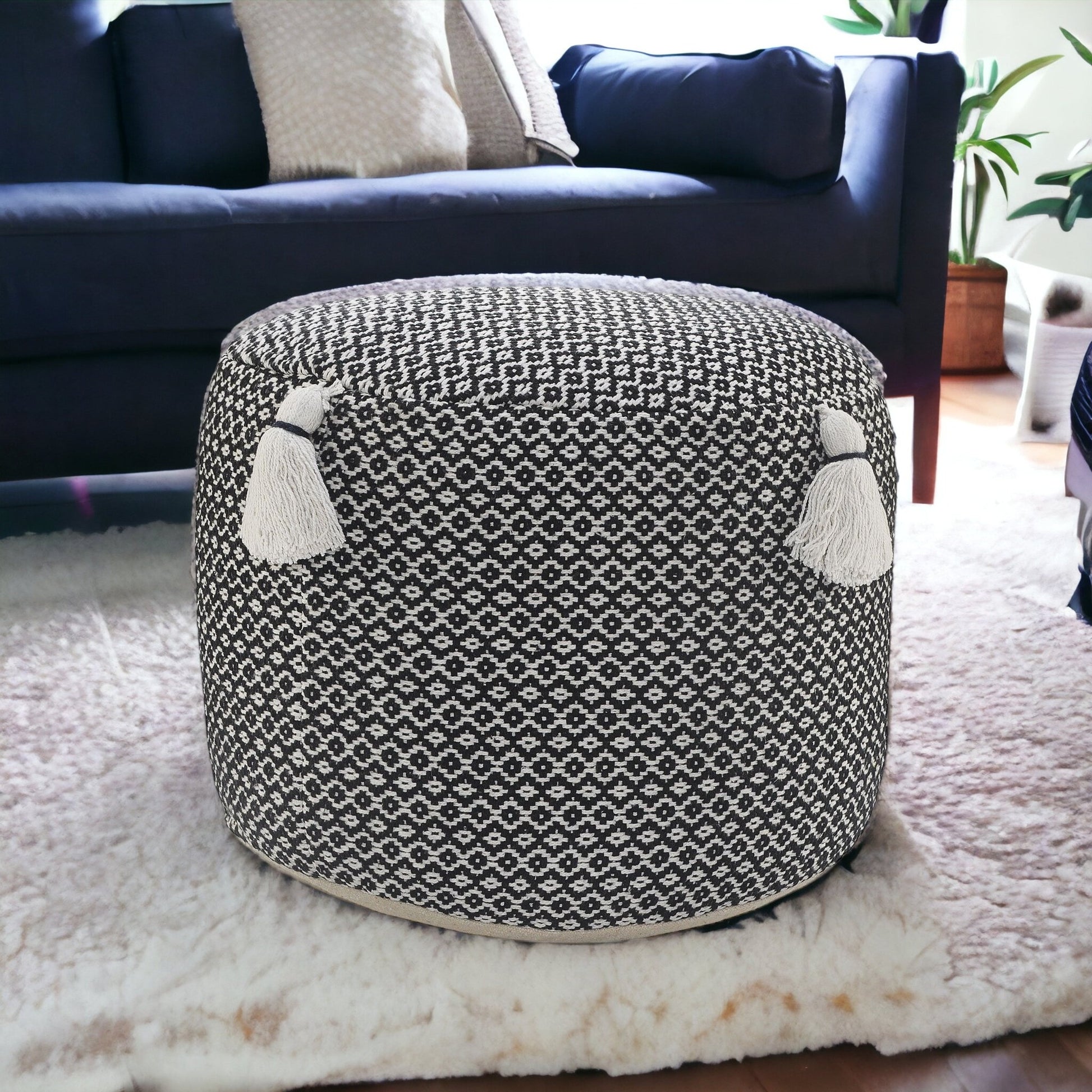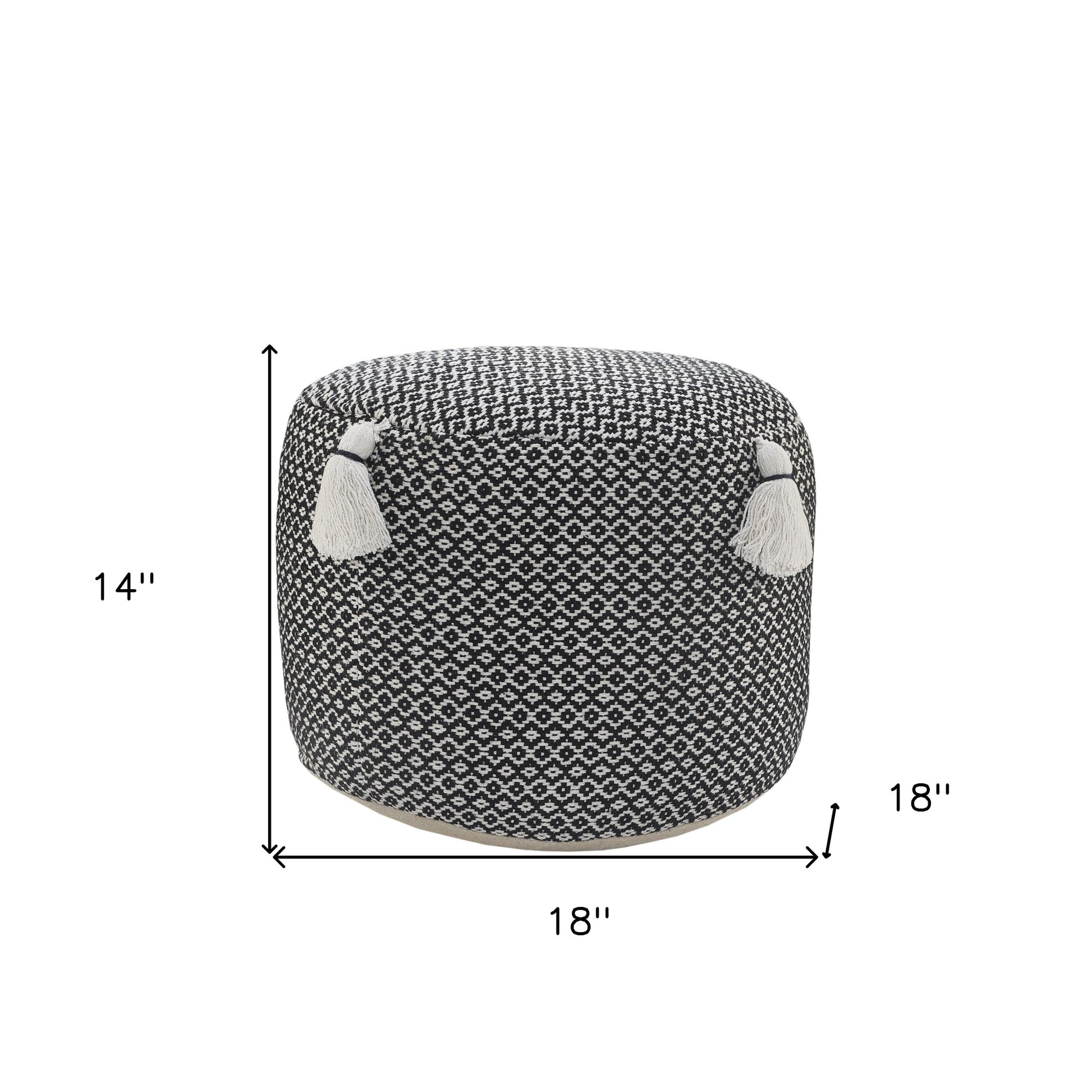 Introducing this stylish and versatile ottoman! Made from 100% cotton upholstery material, this 18-inch black ottoman adds a touch of fashion and functionality to any space. Its compact dimensions of 14-inch H x 18-inch W x 18-inch D make it a perfect fit for any room. Use it as a pouff for floor seating or as a handy extra seat or footrest. The geometric pattern adds a modern touch, while the durable cotton material ensures long-lasting comfort. Whether you're looking for a cozy addition to your living room or a practical accent piece for your bedroom, this ottoman is the ideal choice.