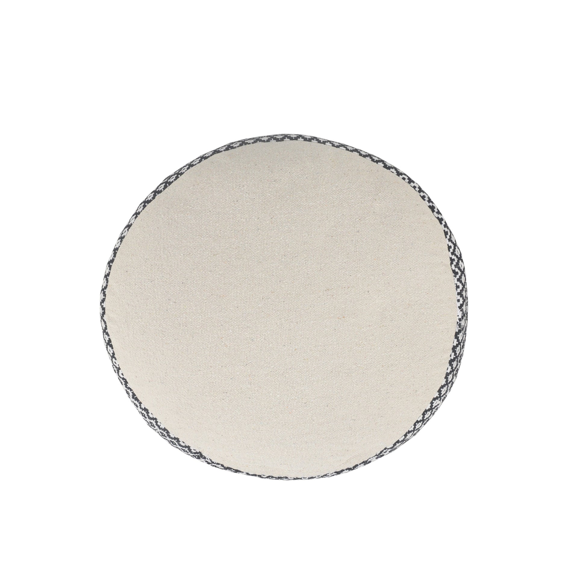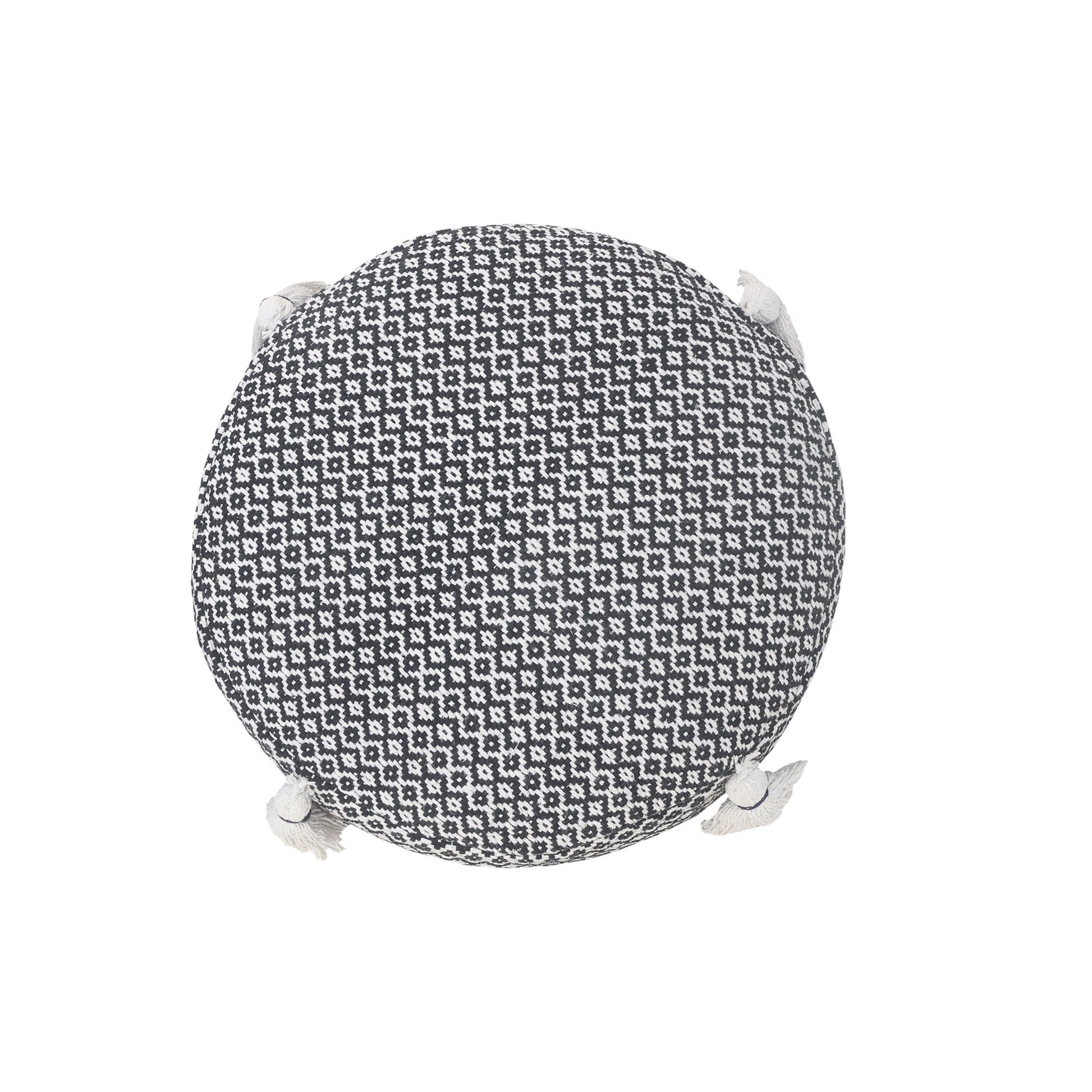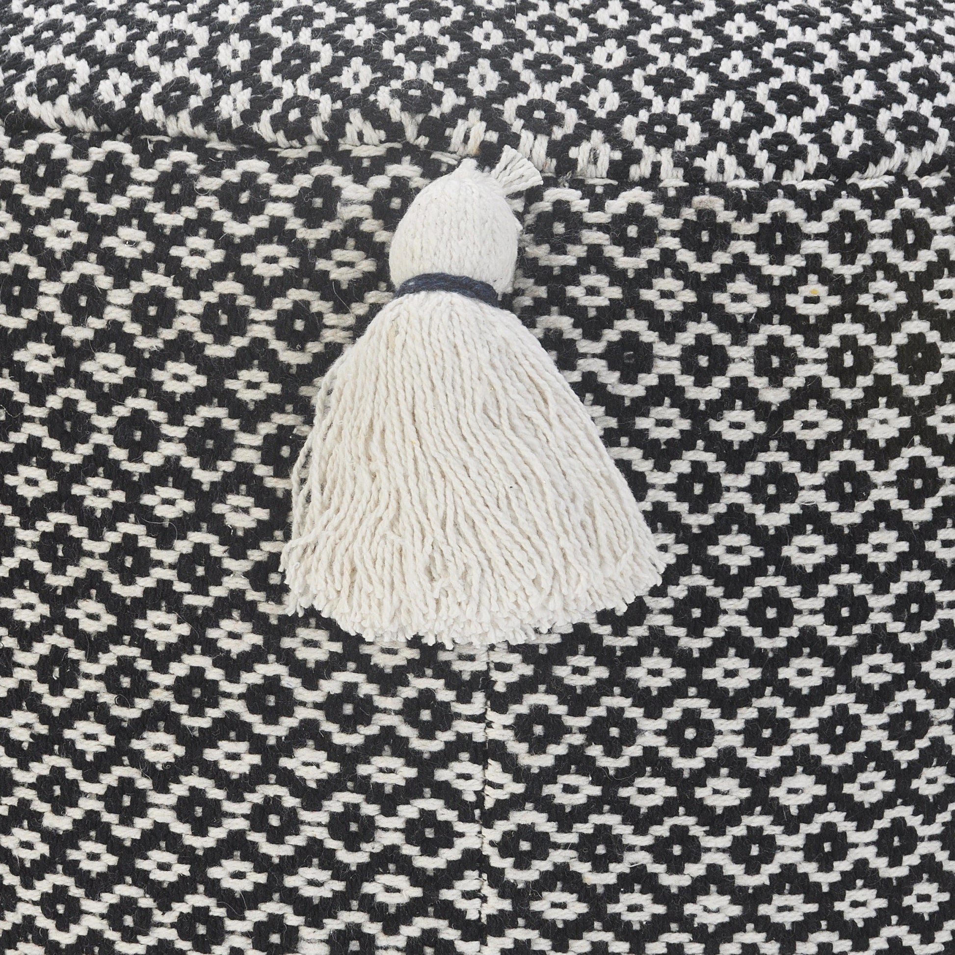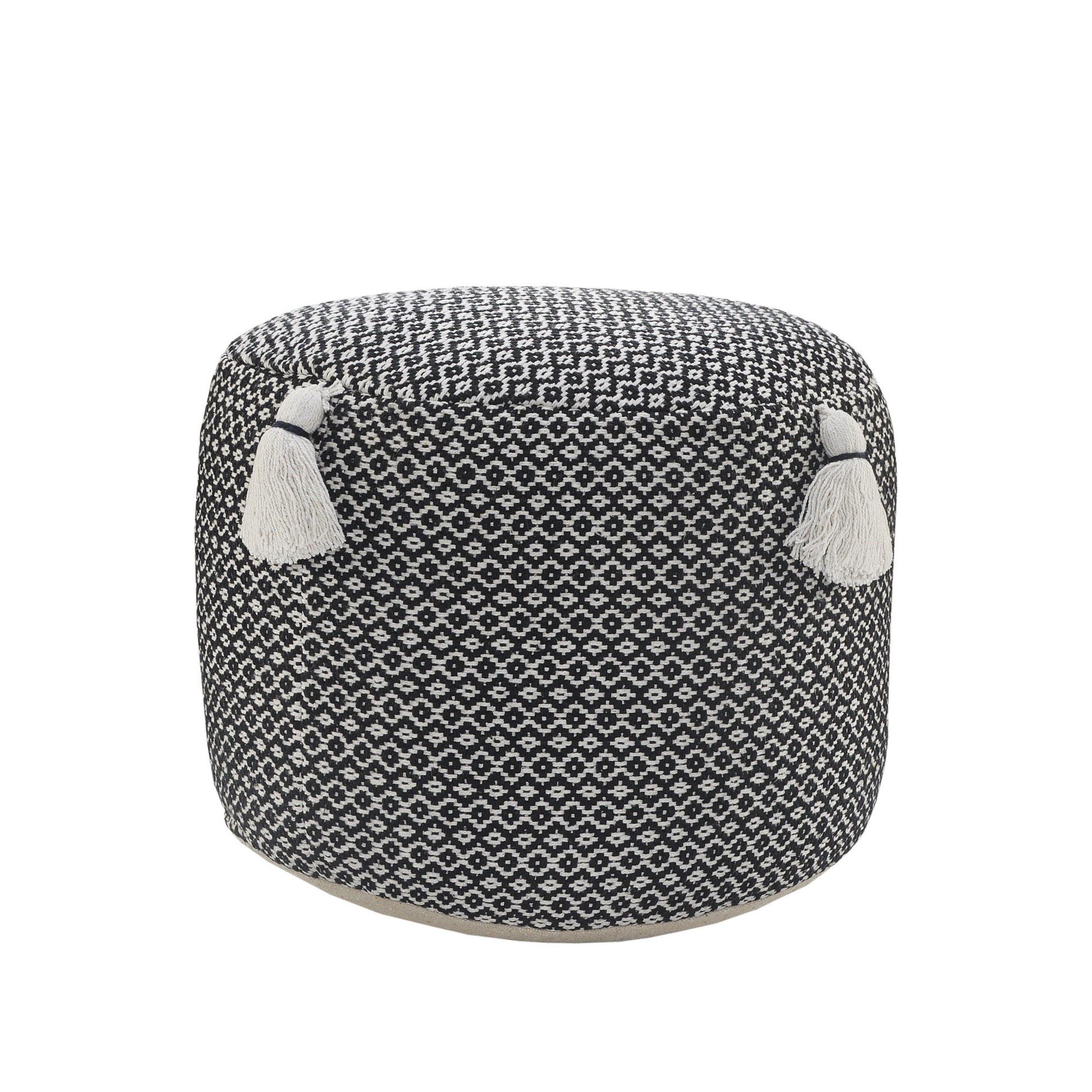Introducing this stylish and versatile ottoman! Made from 100% cotton upholstery material, this 18-inch black ottoman adds a touch of fashion and functionality to any space. Its compact dimensions of 14-inch H x 18-inch W x 18-inch D make it a perfect fit for any room. Use it as a pouff for floor seating or as a handy extra seat or footrest. The geometric pattern adds a modern touch, while the durable cotton material ensures long-lasting comfort. Whether you're looking for a cozy addition to your living room or a practical accent piece for your bedroom, this ottoman is the ideal choice.