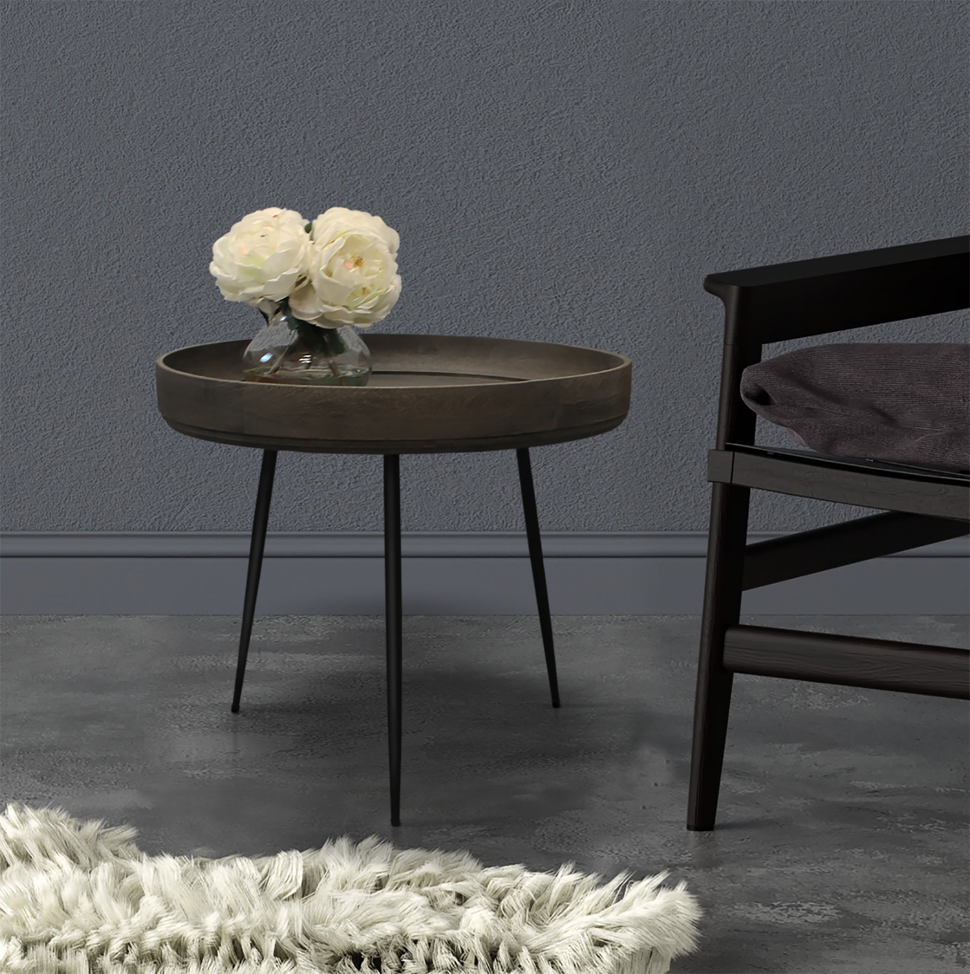 Optimize your space and add some charm to your room with the 18" black and gray solid wood and iron round end table. Quality construction from the black iron base combines with gray solid wood of the top to give this table a fresh and updated look. Complete with a purposefully distressed finish, this table has an aged, vintage, and rustic feel. An ideal location for placing your snacks and drinks, and a place to keep your lamp, frames, or other accessories. You can match it with other pieces to get the ideal look for your place. 18" H x 21" W x 21" D