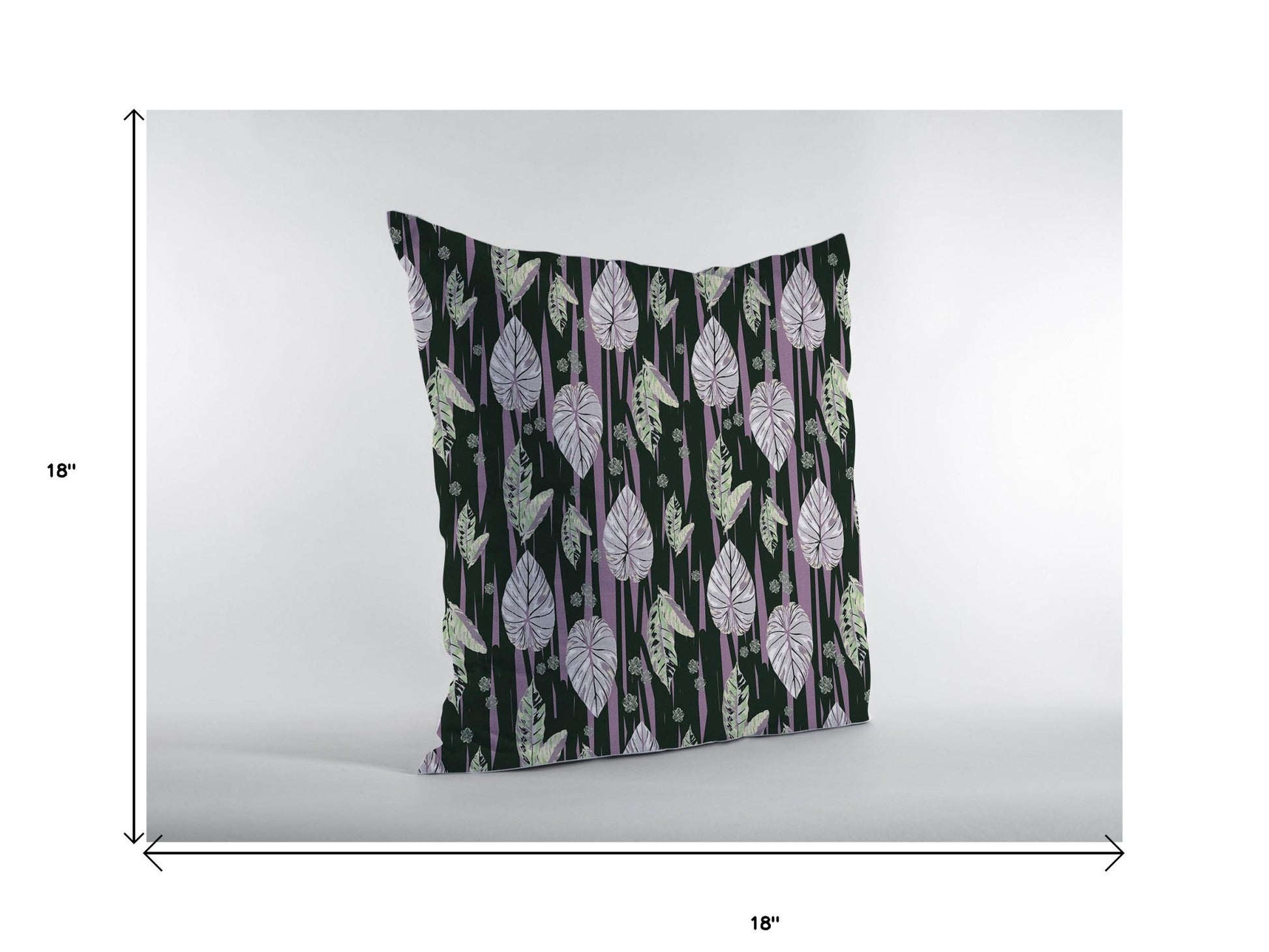 Upscale your living space in a heartbeat with this extraordinary Black Purple Fall Leaves Suede Throw Pillow featuring elements of nature in a modern fashion. Creating a stunning visual impact, the black backdrop flaunts tropical leaves and vines in gorgeous bright lilac and soft green tones to complement it. The deluxe suede fabric featured on the throw pillow gives it a premium feel while also being durable to last for a long time. The versatile blown and closed pillow is also soft to the touch, given its lush polyfill insert, making it super fluffy and comfortable. This versatile decorative pillow is sure to light up any room, whether your style is bohemian, coastal, or bohemian. 18” x 18” x 5”