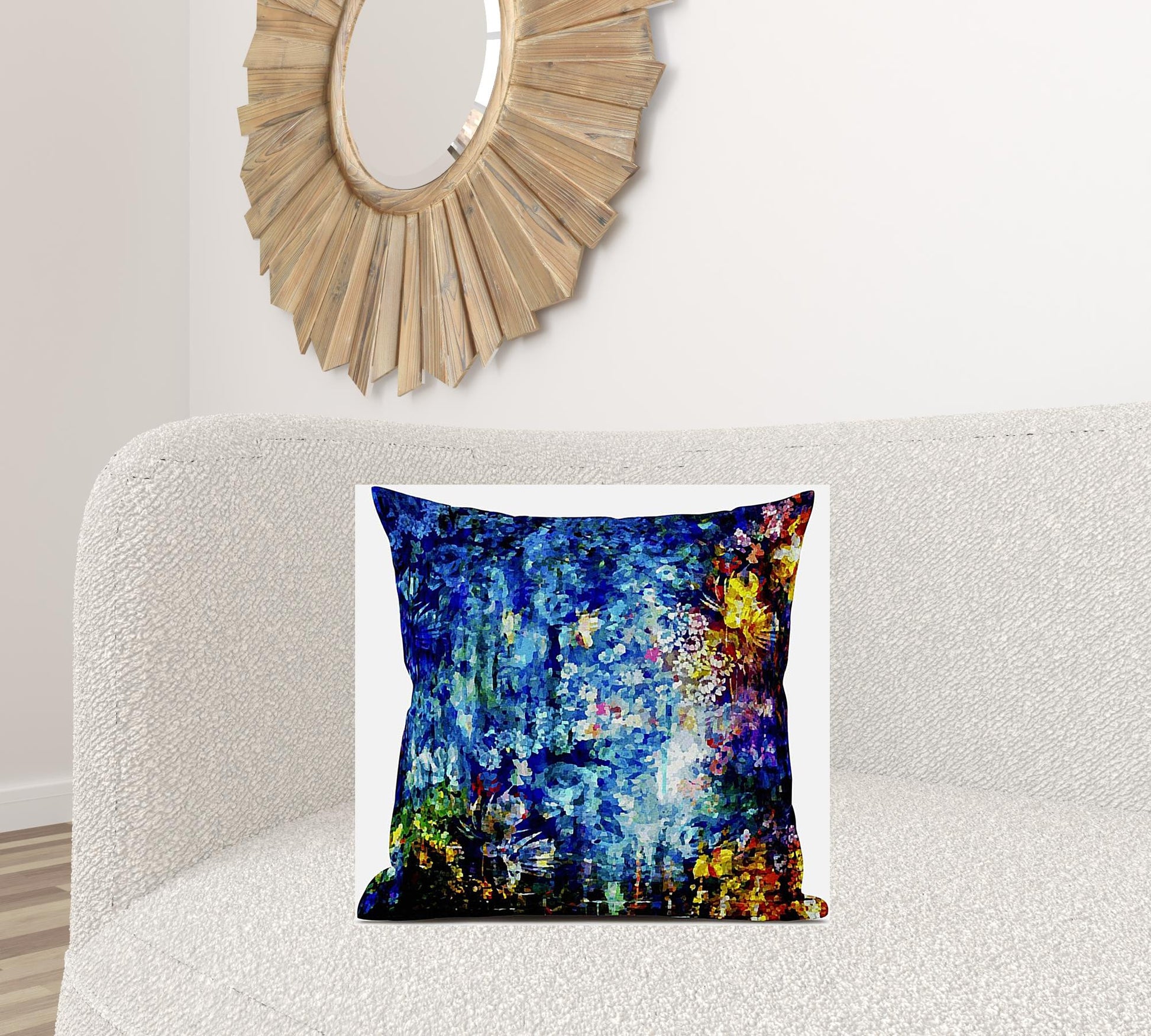 Delve into a realm of euphoria and bliss with this alluring Bright Blue Yellow Springtime Zippered Suede Throw Pillow that will have you hypnotized by its sheer artistry. Featuring a myriad of tranquilizing hues such as bright blue, canary yellow, and hints of turquoise and orange, it is sure to radiate a powerful aura of serenity and grace throughout your living room. Made from premium quality leather-like suede fabric for enhanced durability and utmost softness, this pillow will serve as a plush accent piece for your home. It comes with a soft polyfill insert for added fluffiness that provides utmost comfort to your back and neck while the zippered closure makes the cover easy to take off and clean. To fill your home with a contemporary rush of elegance and signature beauty, choose this jaw-dropping throw pillow to elevate your living space décor. 18” x 18” x 5”