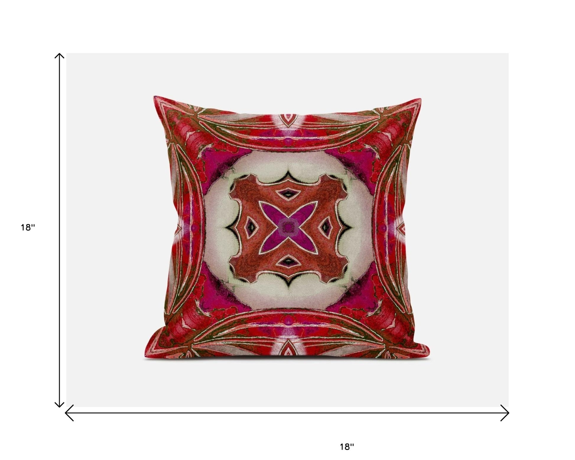 This rich Fuchsia Red Geo Tribal Suede Throw Pillow makes a fascinating bohemian piece of decor for your home that has a tribal feel with a touch of springtime aura. The vibrant fuchsia and red-colored ethnic pattern is elegantly framed inside a circular spectrum of muted peach, white, and hot pink while the wavy sage green lines around the sides offer uniqueness to this throw pillow. This blown and closed pillow is made of sleek and smooth suede fabric that provides a plush and gorgeous look while ensuring long-lasting durability to serve you for years to come. It features a soft polyfill insert that makes it very fluffy and comfy to rest on while giving the piece a luxurious appeal. Pair this decorative pillow with neutral or cool-toned decors and it will seamlessly blend in with its surrounding. 18” x 18” x 5”