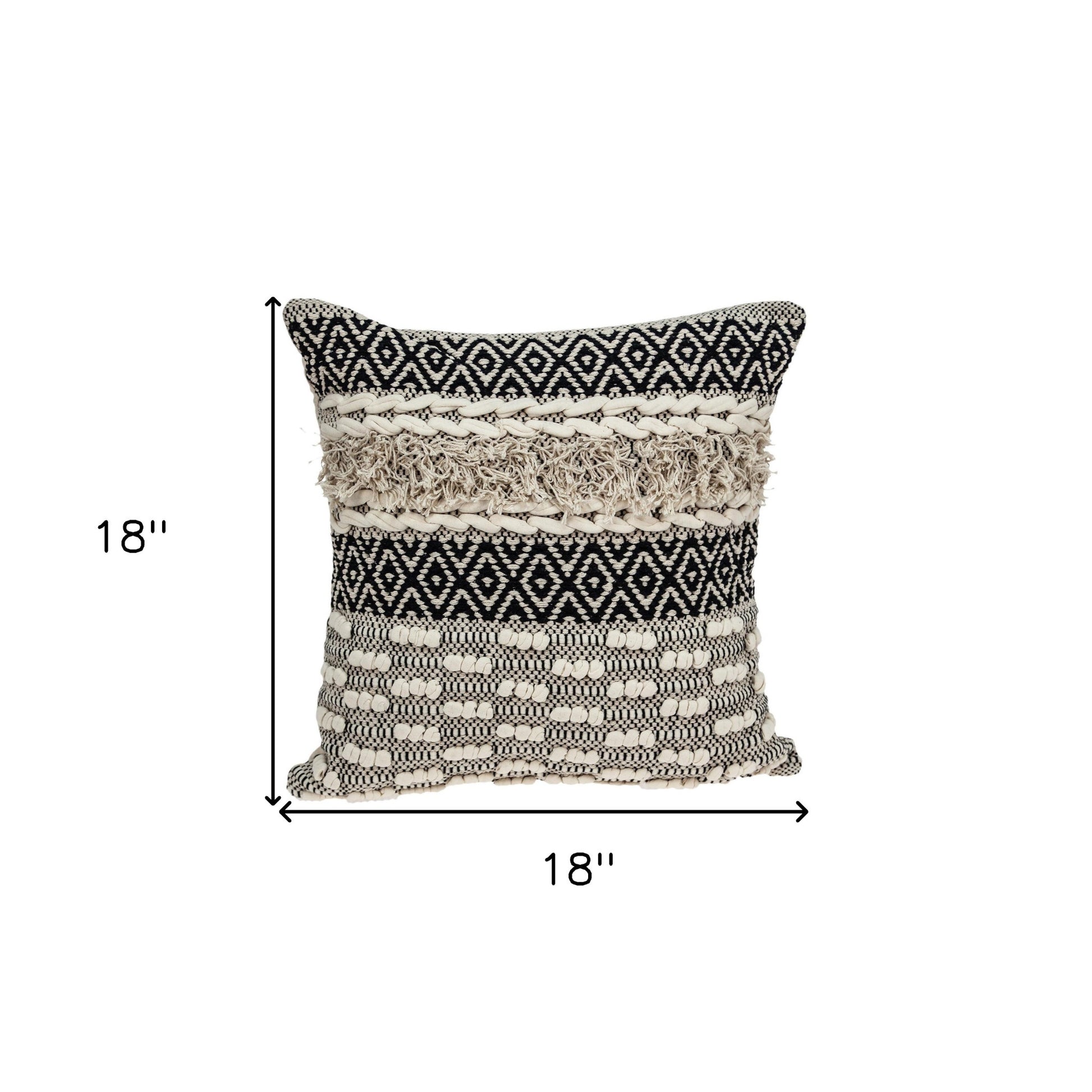 18" X 18" Beige And Black Zippered 100% Cotton Throw Pillow With Fringe