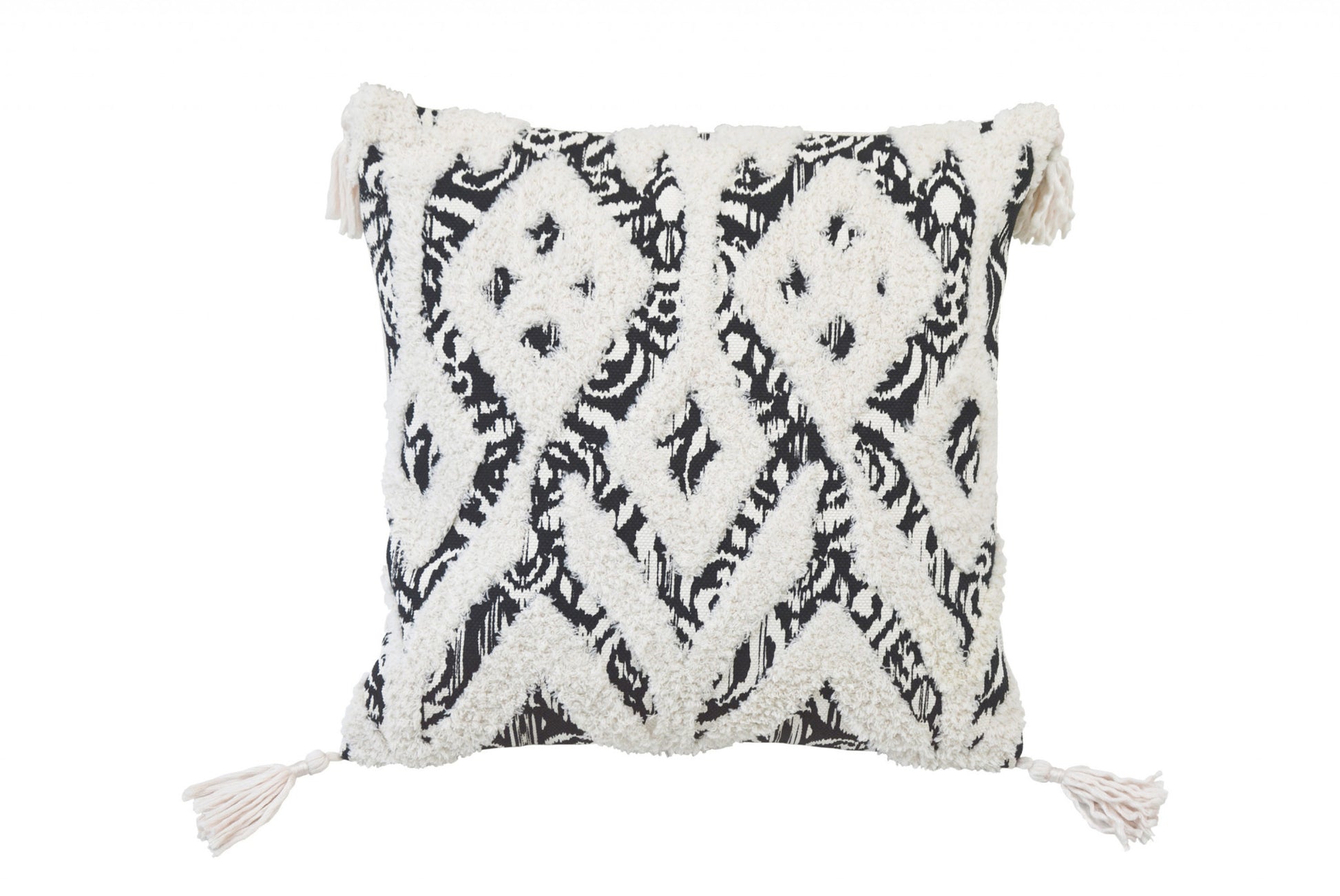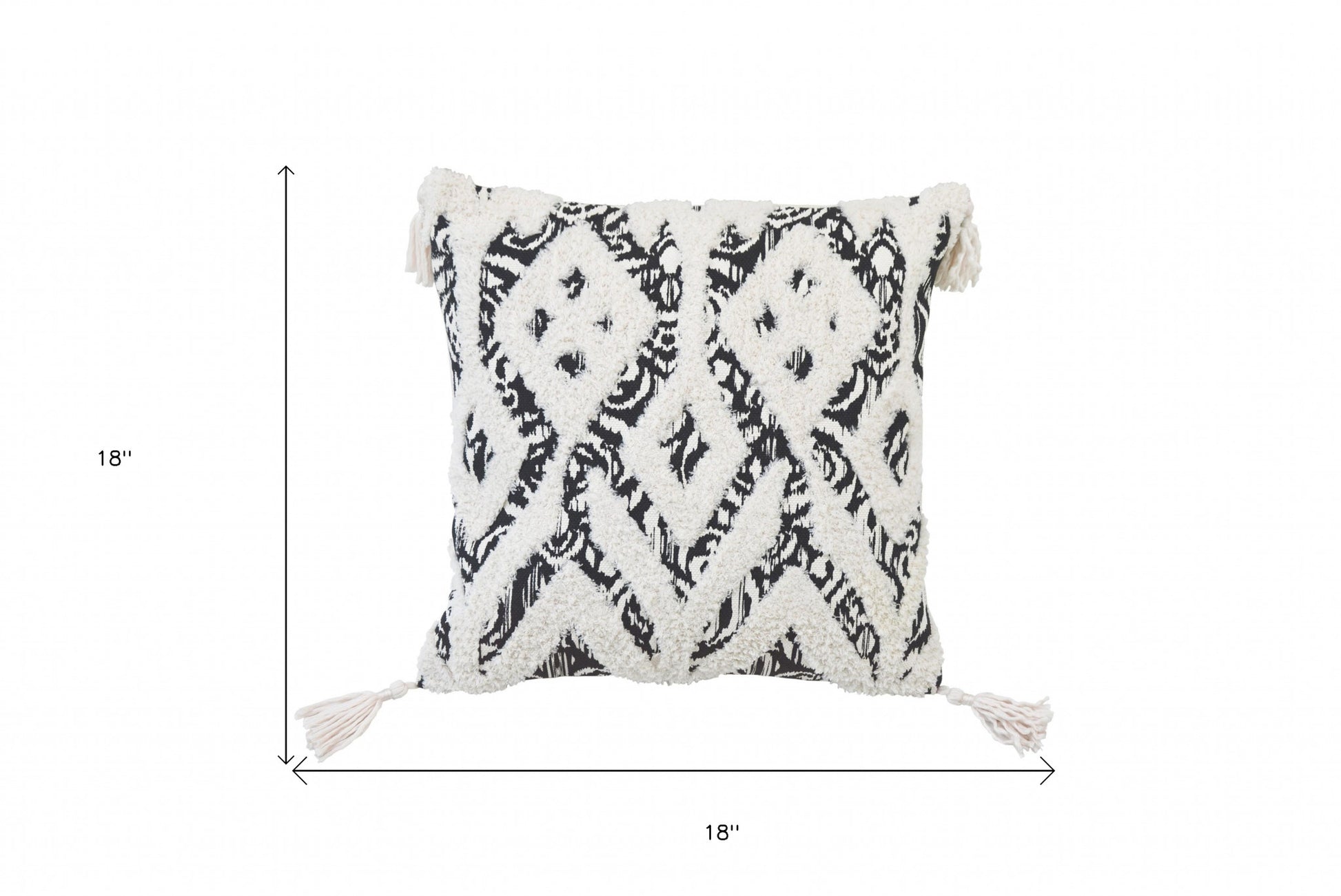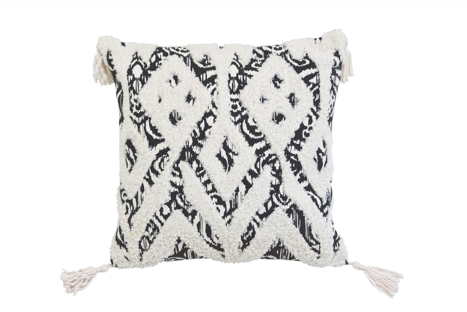 18" X 18" Black And White Ikat Zippered Polyester And Cotton Blend Throw Pillow With Tassels