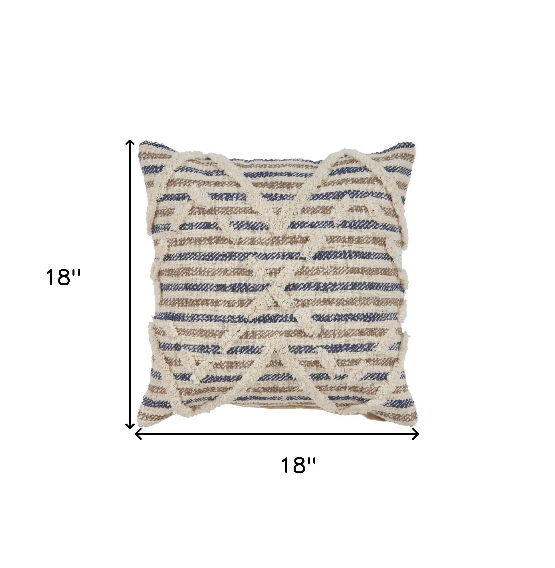 18" X 18" Blue and Beige Striped Cotton Zippered Pillow