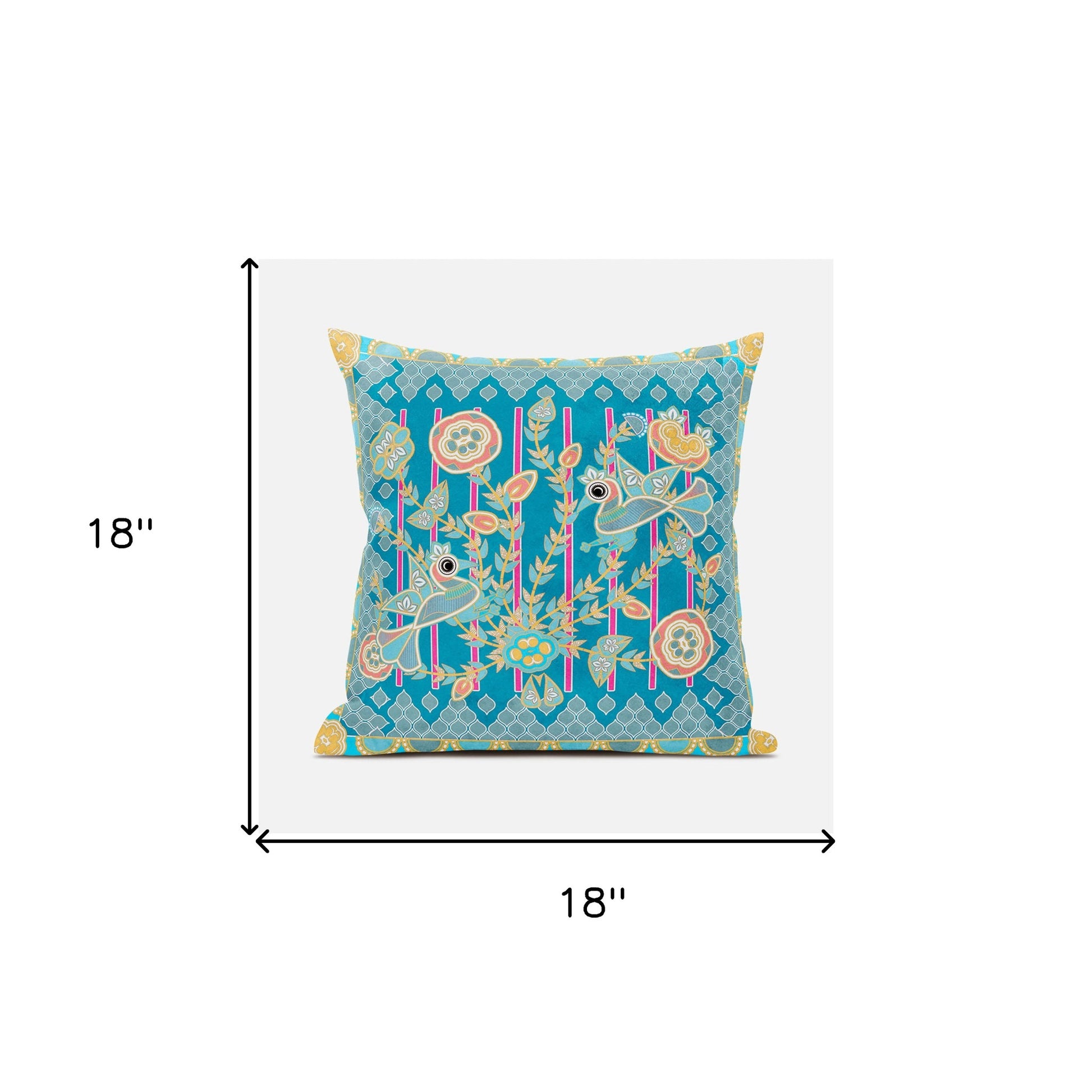 18" X 18" Blue and Gold Peacock Broadcloth Floral Zippered Pillow