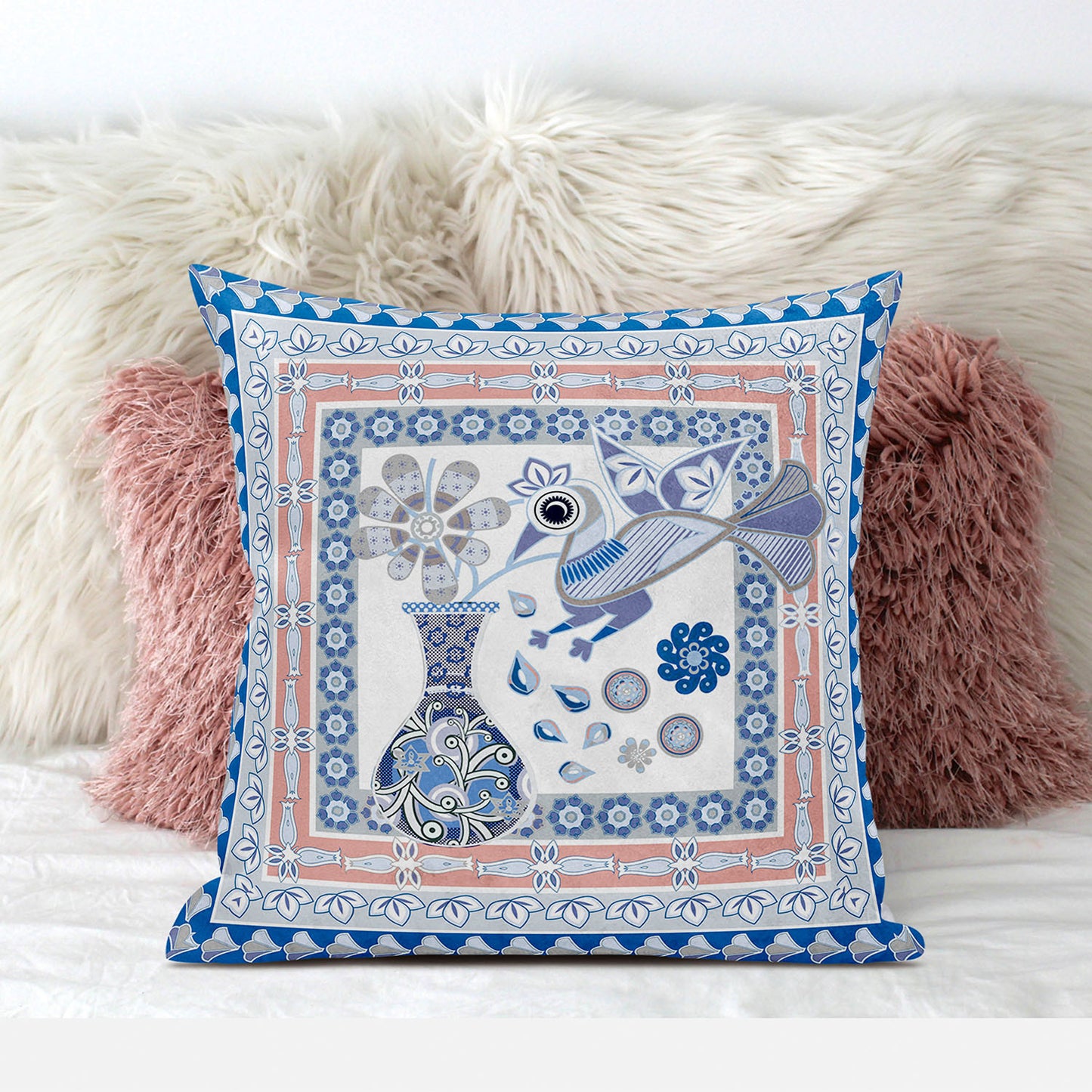 18" X 18" Blue and Gray Peacock Broadcloth Floral Zippered Pillow
