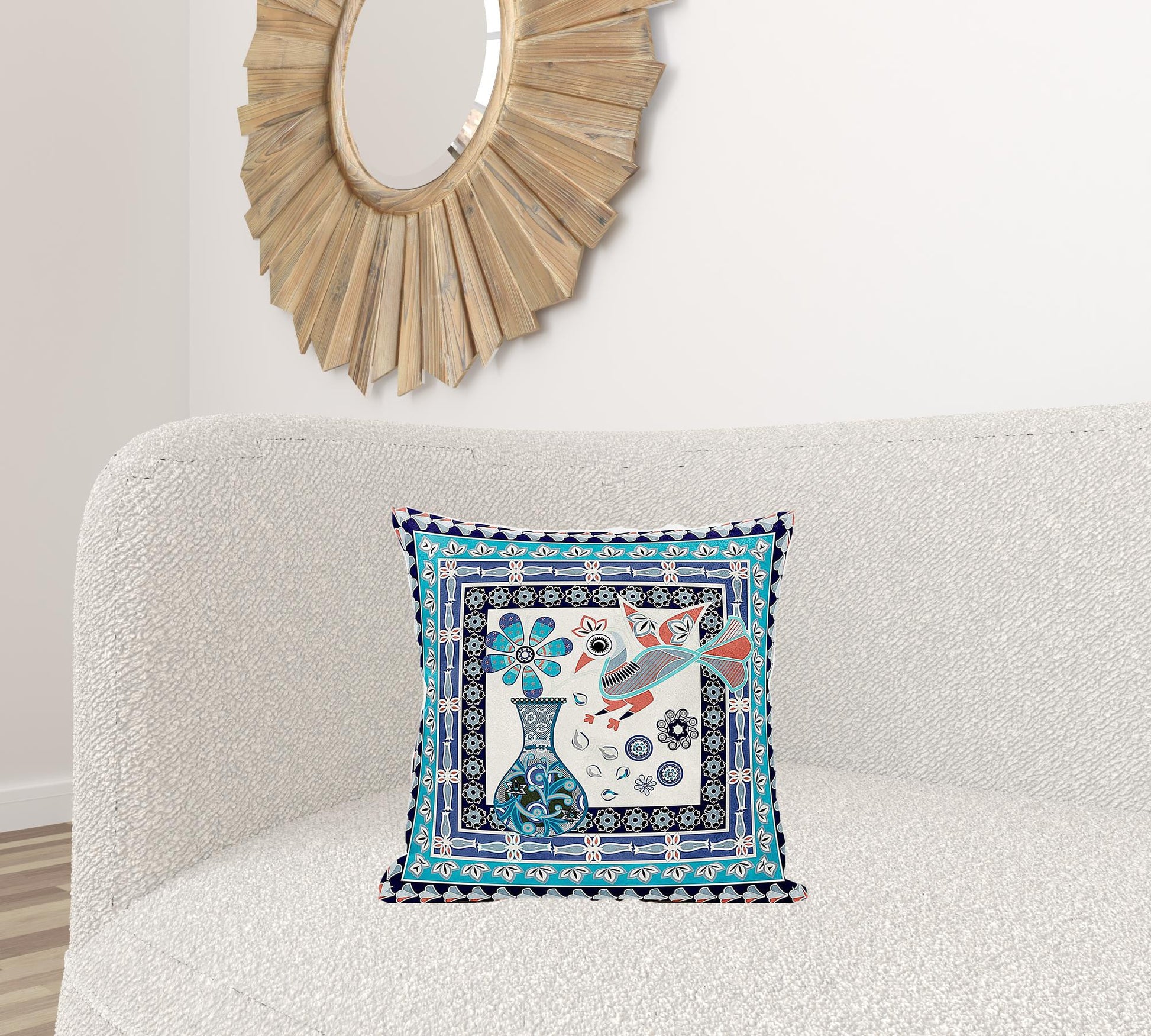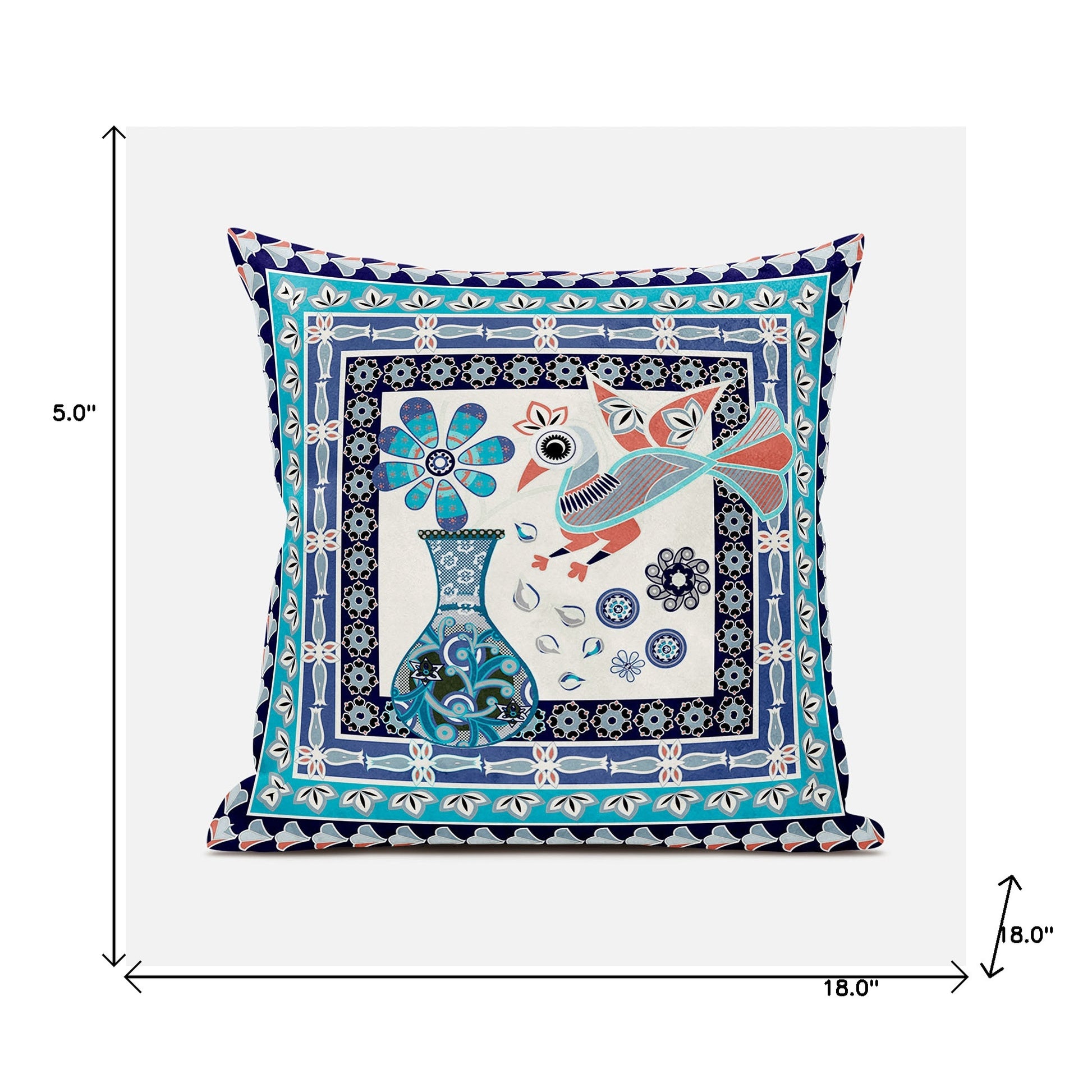 18" X 18" Blue and Off White Peacock Broadcloth Floral Zippered Pillow