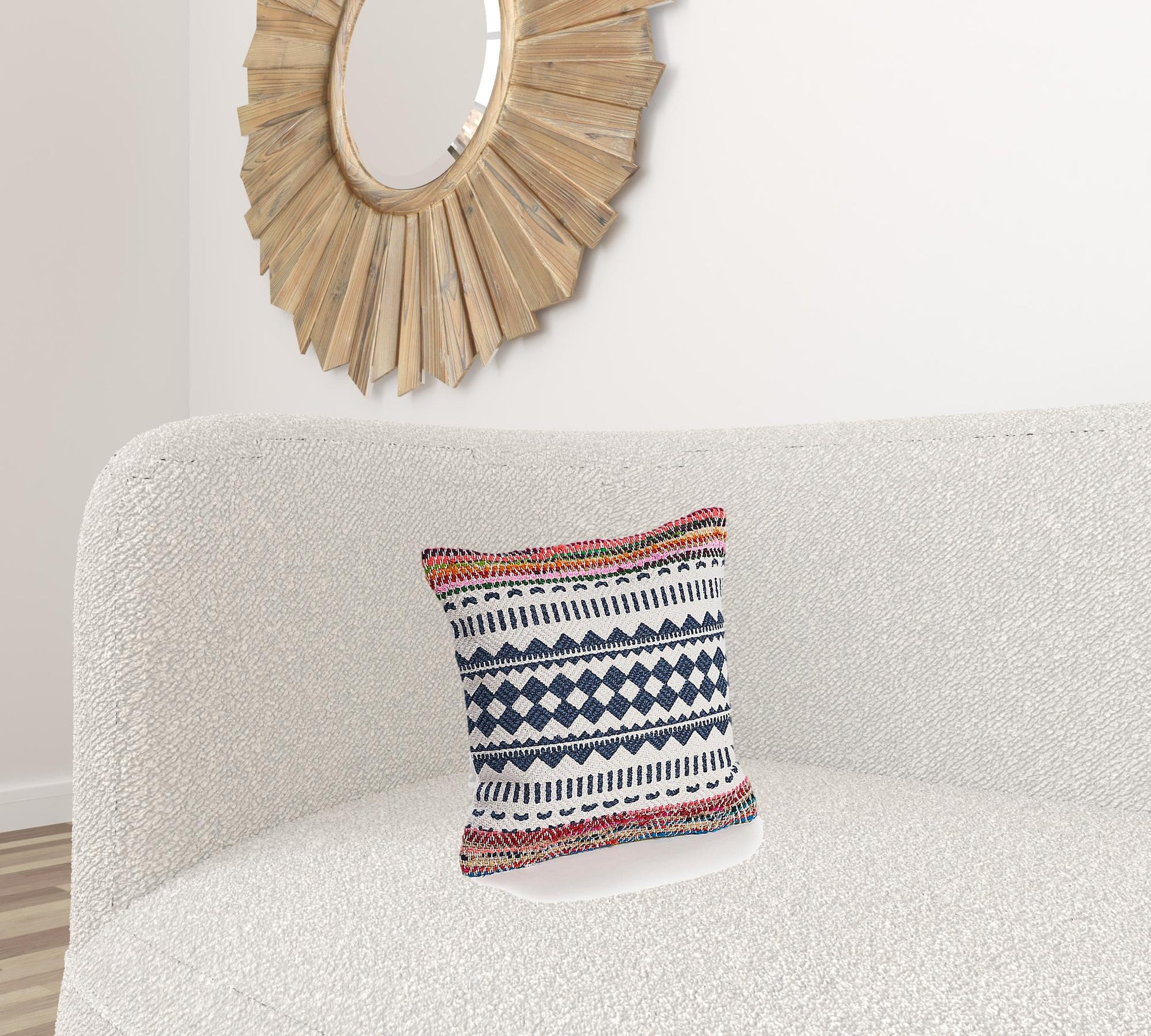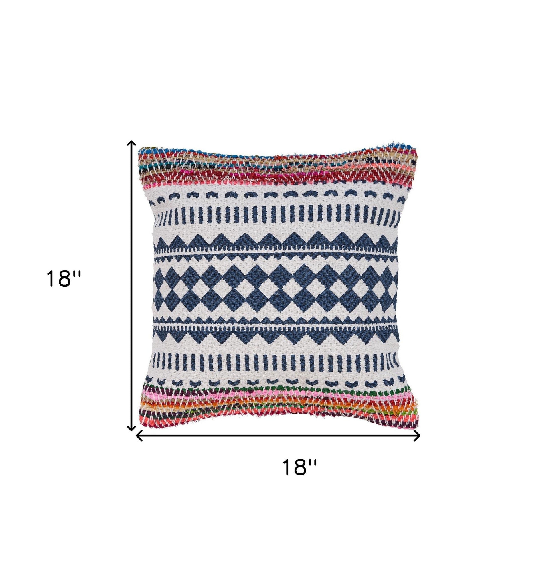 18" X 18" Blue White Red And Yellow 100% Cotton Striped Zippered Pillow