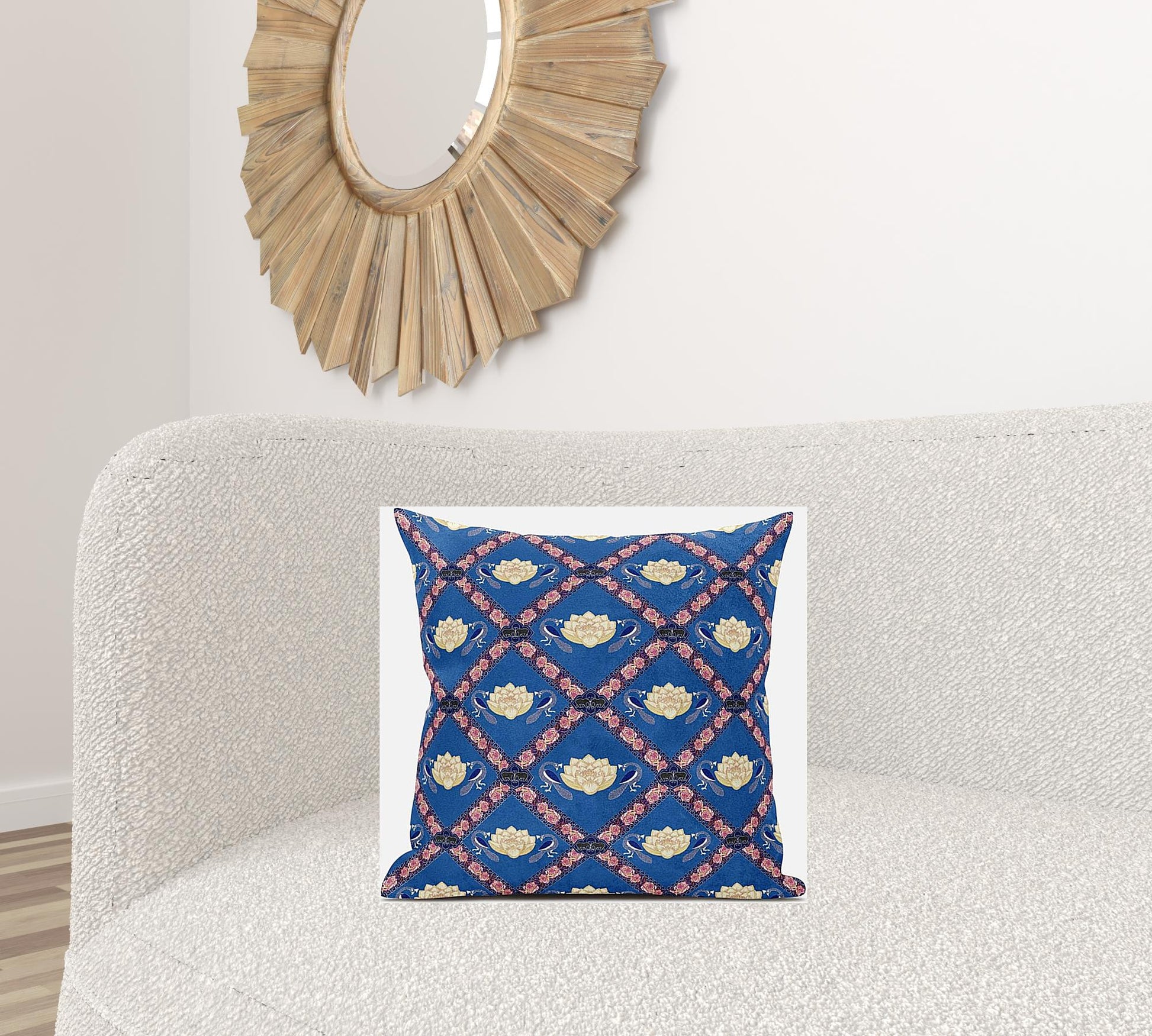18" X 18" Blue Yellow Pink Lotus Floral Blown Seam Suede Throw Pillow