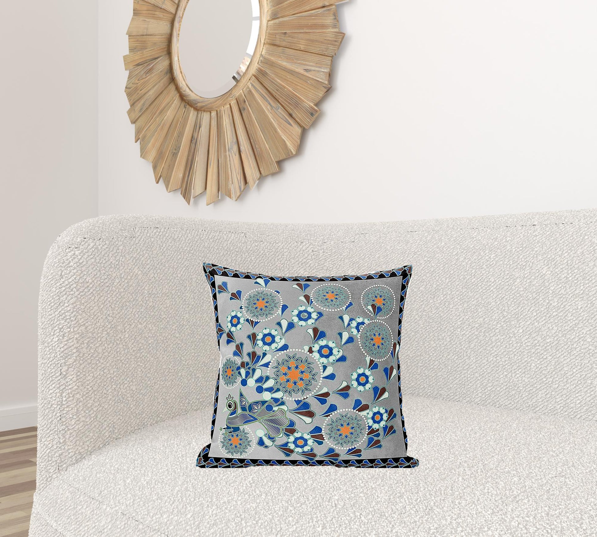 18" X 18" Gray and Black Peacock Broadcloth Floral Zippered Pillow