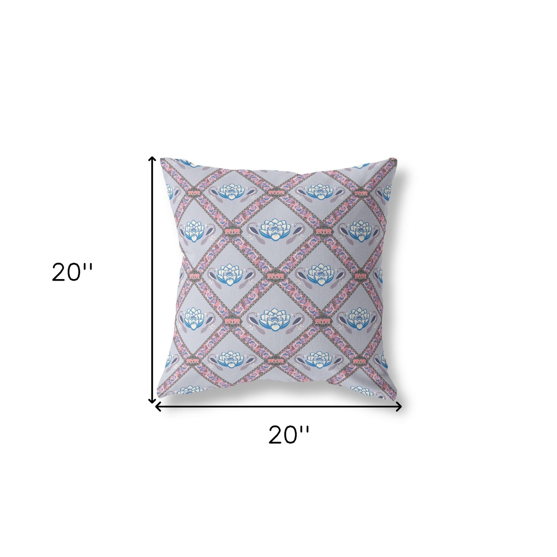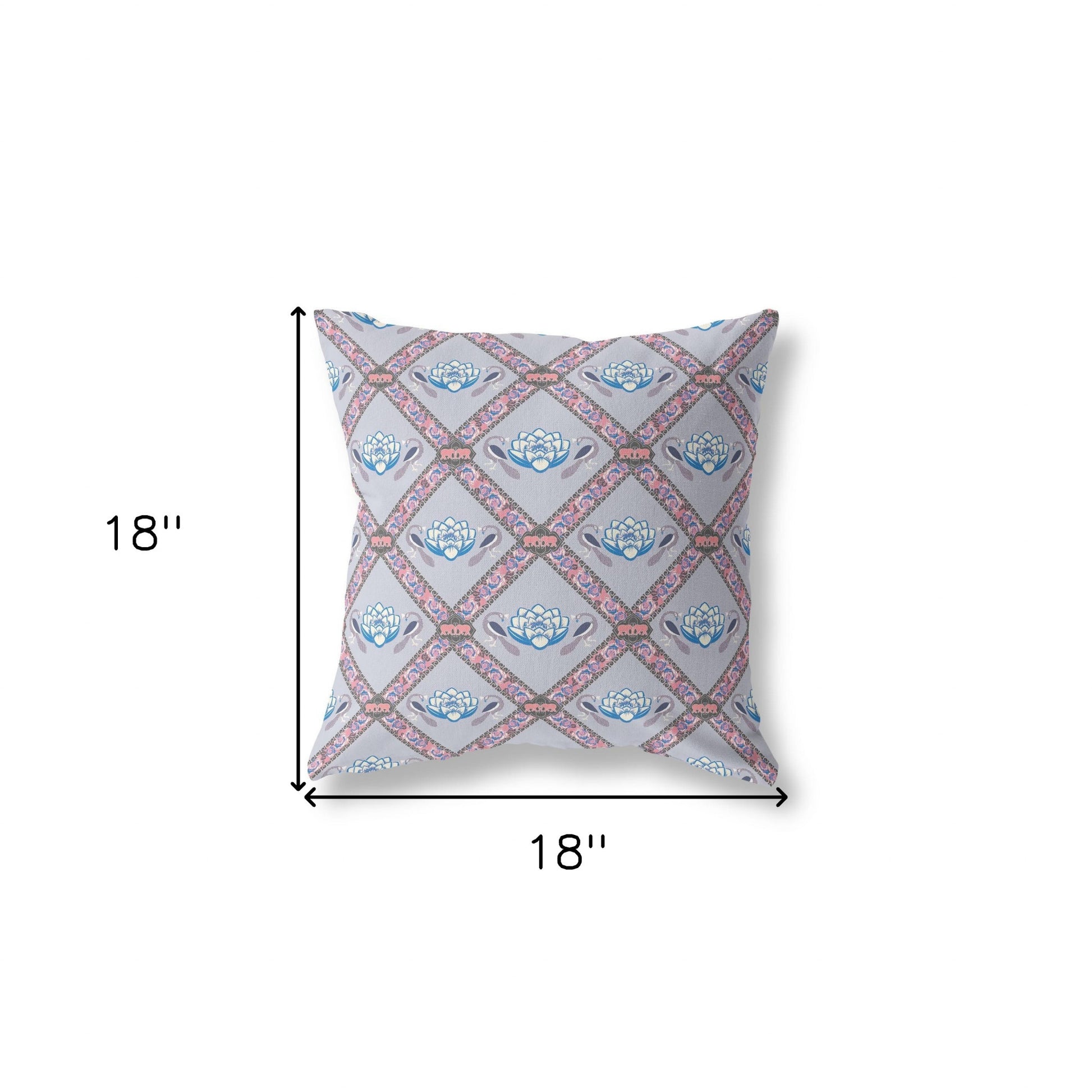 18" X 18" Gray Blue Pink Lotus Floral Blown Seam Suede Throw Pillow