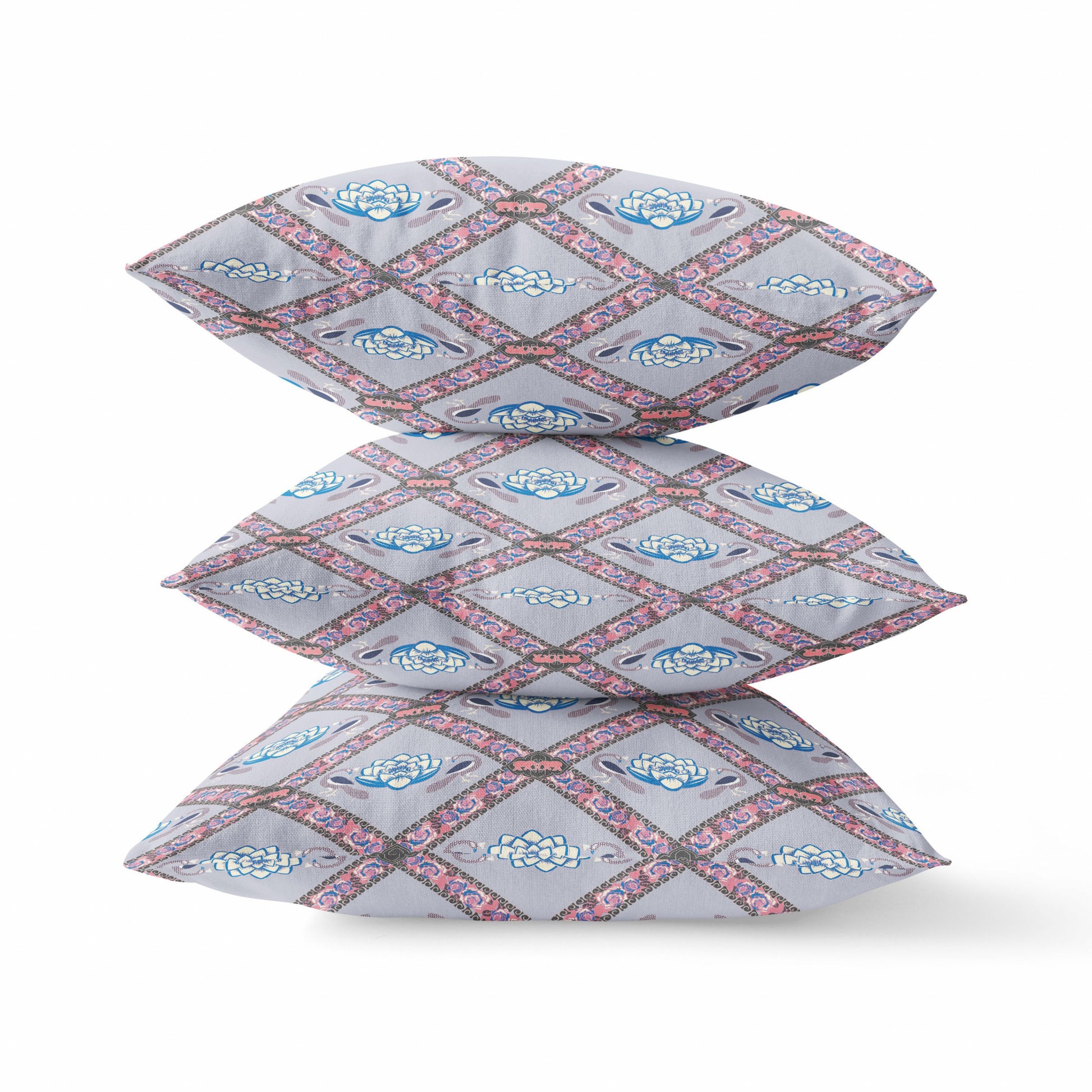 Keywords | seam suede throw pillow, blown seam suede throw pillow, pink lotus floral blown seam, x18" X 18" gray blue pink lotus, 18" X 18" gray blue pink |