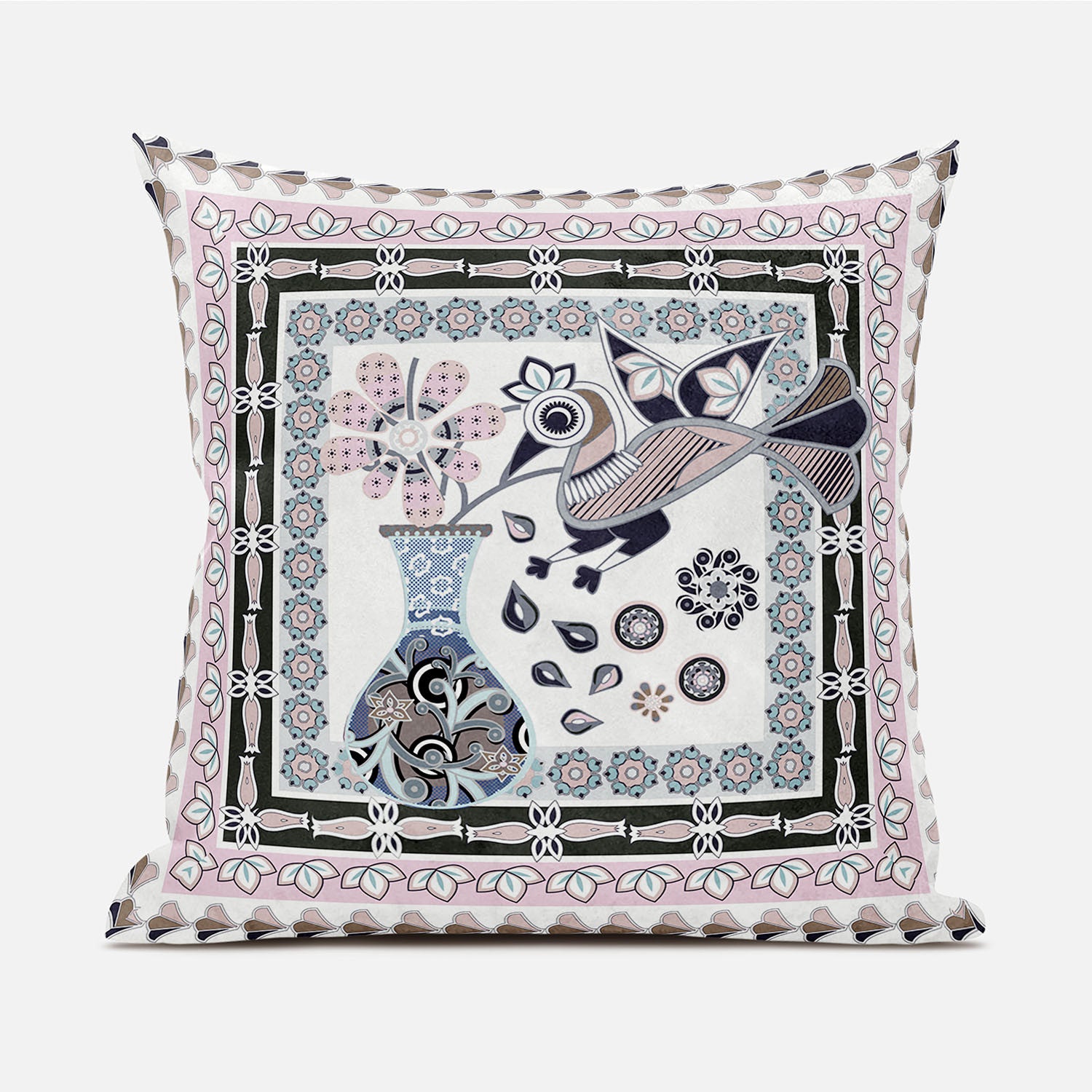 18" X 18" Pink and Black Peacock Broadcloth Floral Zippered Pillow