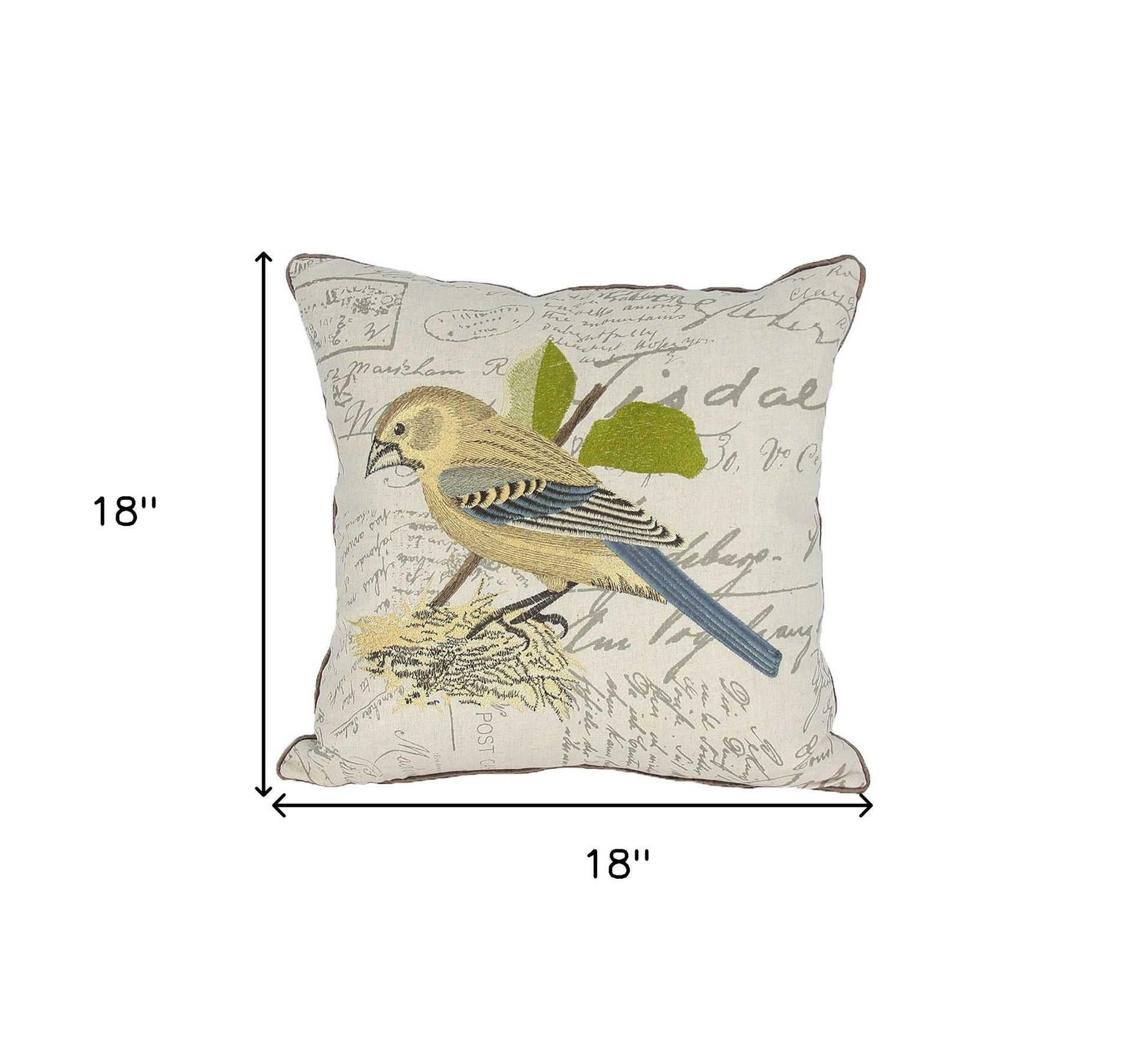 18"x18" Beige and Brown Bird Linen Blend Bird Print Zippered Pillow