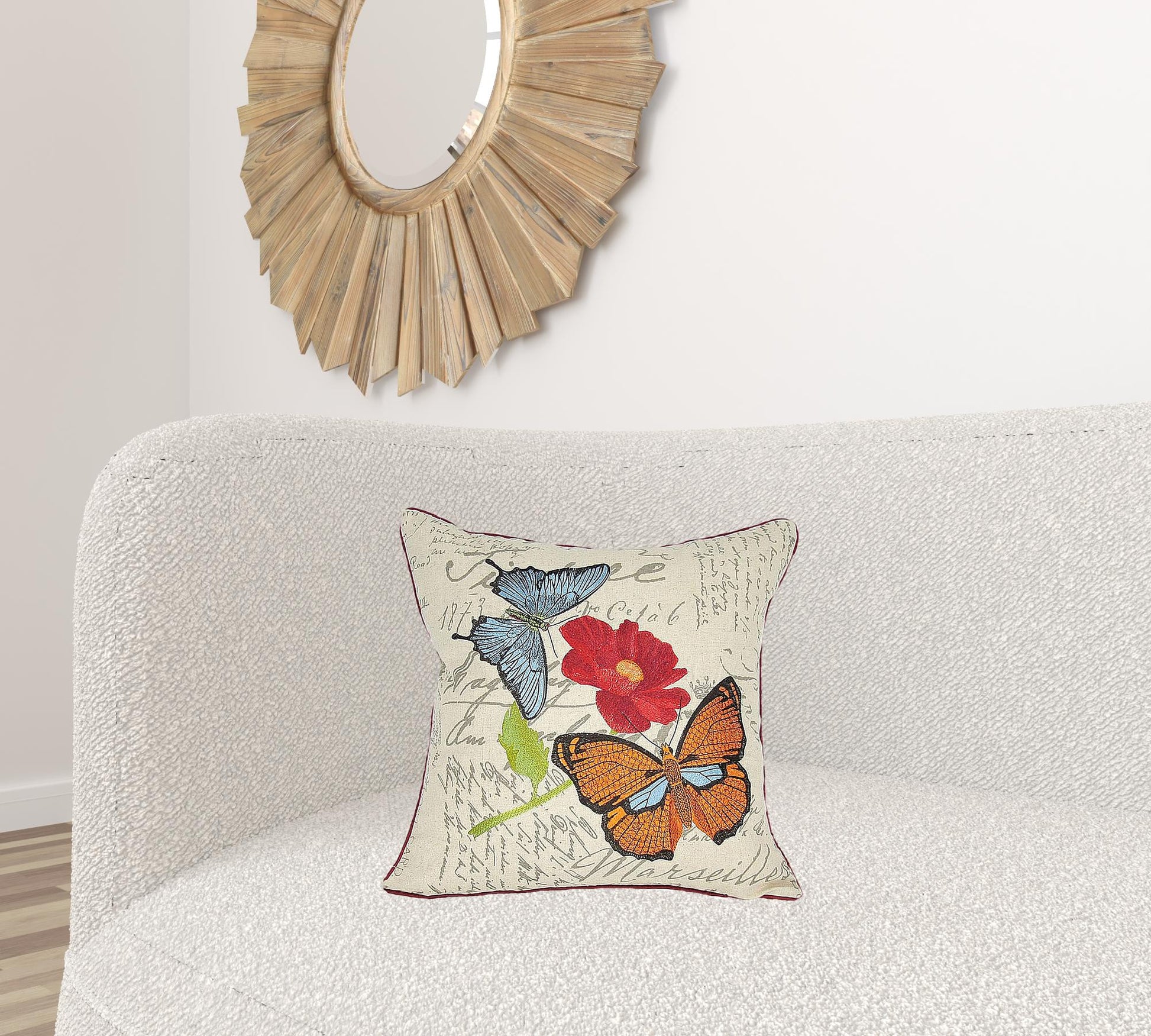 18"x18" Beige and Red Butterfly Linen Blend Floral Zippered Pillow