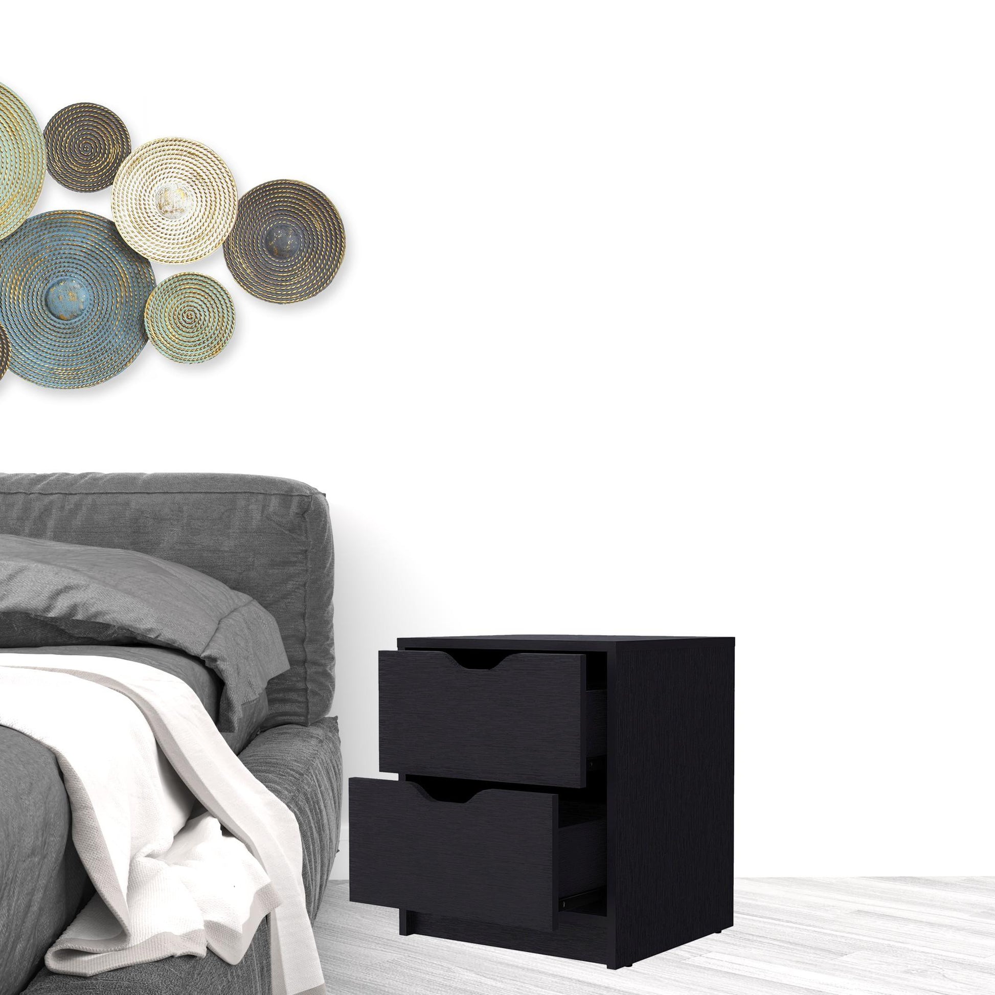 Good looking design and practical styling meet to form this 19-inch black two drawer nightstand with integrated tech. Robust in design, the bed side table has been expertly crafted from manufactured wood. The piece has 2 drawers to store your bedtime essentials close to you as you rest. Includes integrated technology to keep you charged and connected. The unsung hero of the bedroom, this nightstand is perfect for keeping a glass of water, lamp, alarm clock, jewelry, and more, close by and easily accessible. Look no further than this nightstand to accommodate all your needs and upgrade the style of your bedroom. 18.9-inch H x 16.1-inch W x 14.3-inch D
