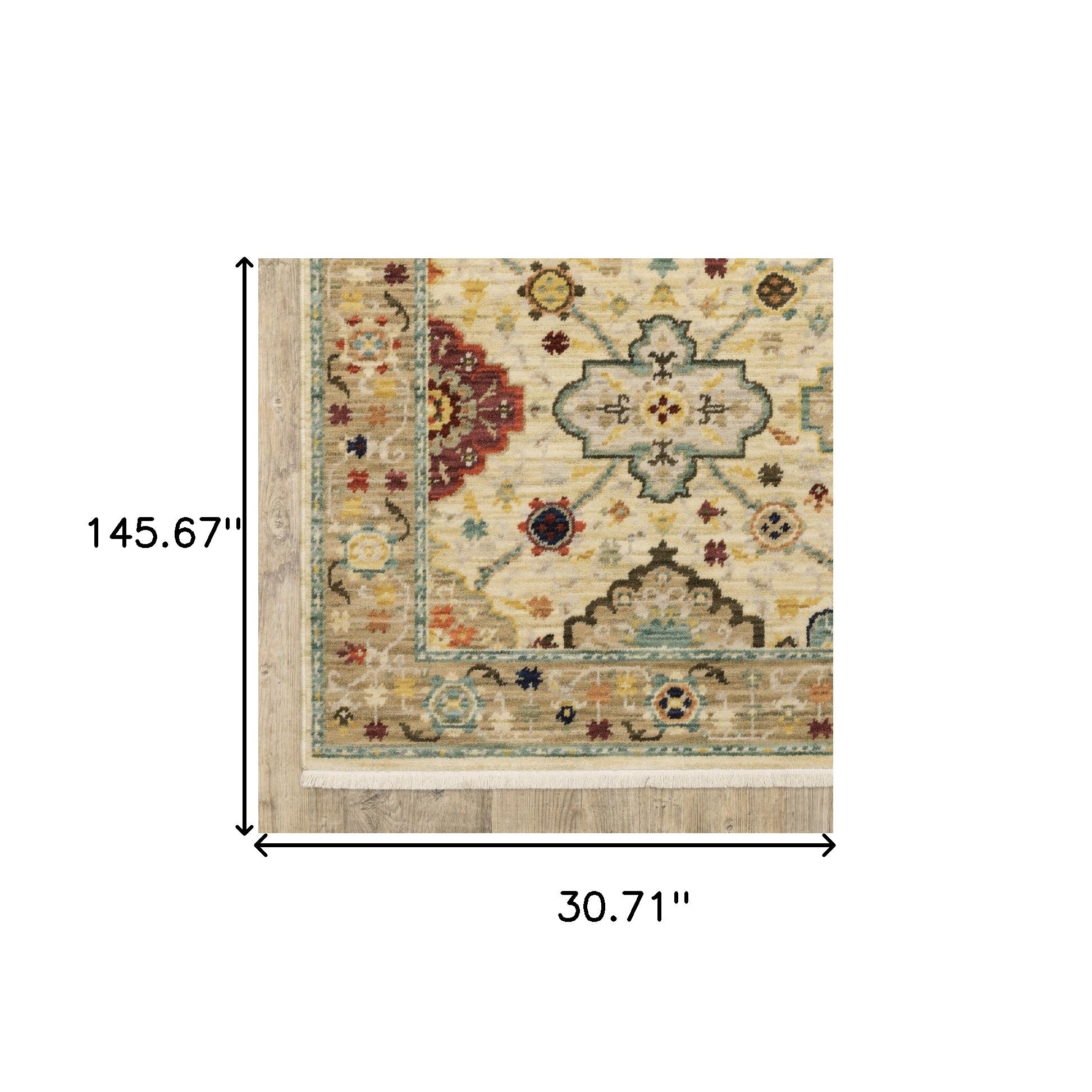 Add some artistry to your room with this 2' x 10' beige and ivory oriental power loom runner rug with fringe. This runner shaped rug features a oriental design in beige and ivory to give it visual interest. A classic shape marries with good looking design for your space Ideal for spaces with kids and pets, this rug is stain resistant to help repel stains and spilled liquids. Tassel ends bring a timeless and fashionable look to your interior. Place this area rug against a hardwood or tile floor and it will enliven your living space with style and sophistication. 0.31" H x 30.71" W x 145.67" D
