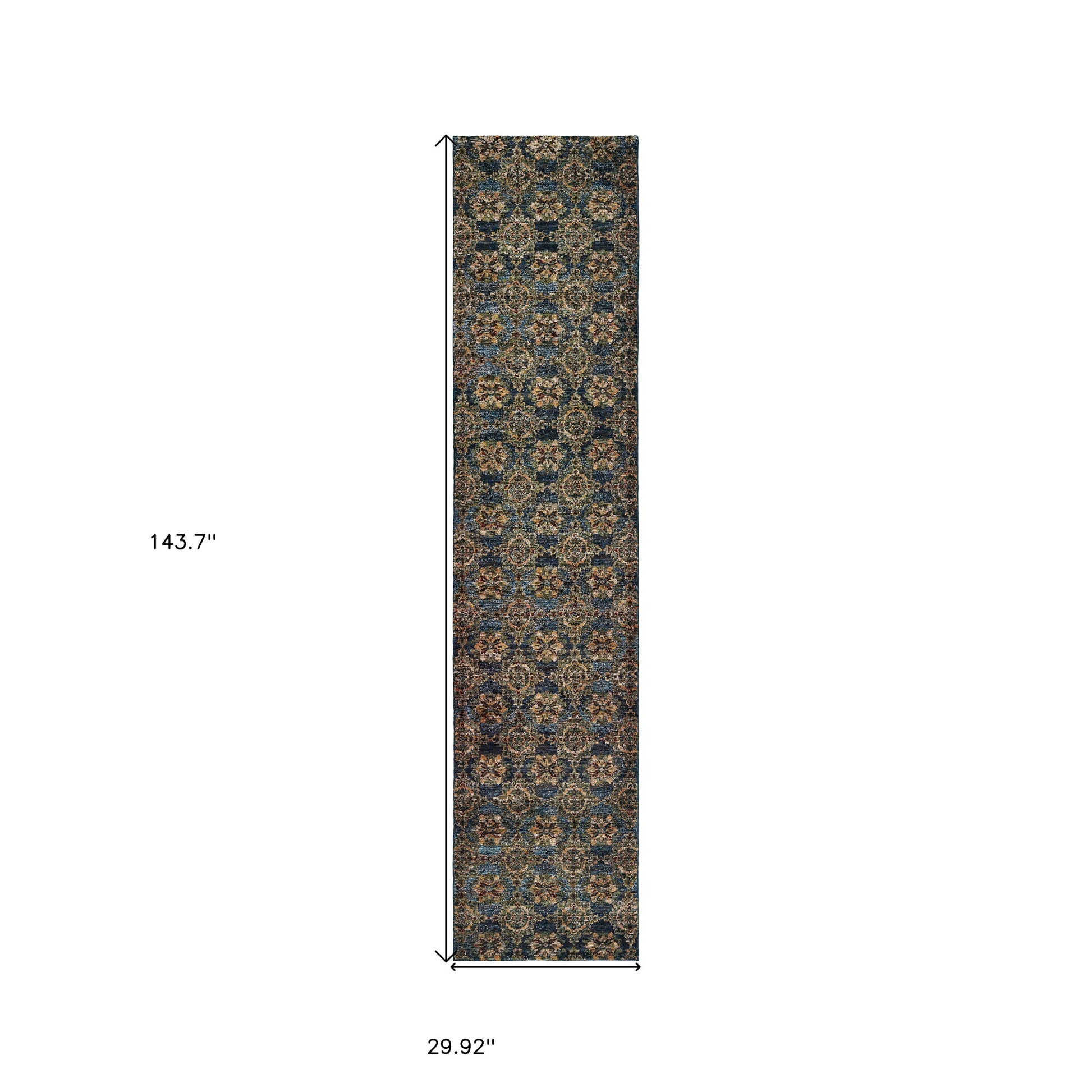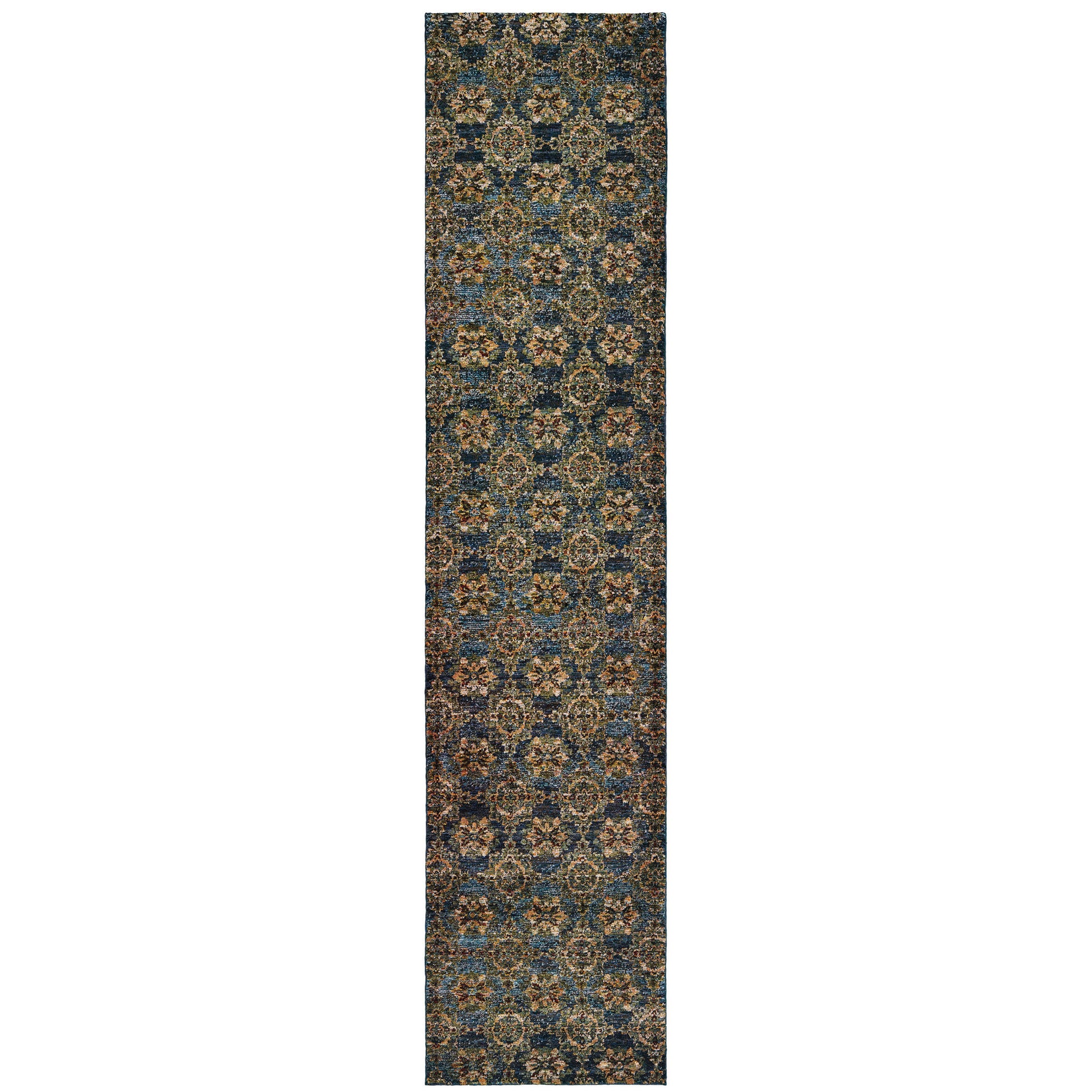 Add some artistry to your room with this 2' x 10' blue and gold oriental power loom stain resistant runner rug. This runner shaped rug features a oriental design in blue and gold to give it visual interest. A classic shape marries with good looking design for your space Ideal for spaces with kids and pets, this rug is stain resistant to help repel stains and spilled liquids. Place this area rug against a hardwood or tile floor and it will enliven your living space with style and sophistication. 0.55" H x 29.92" W x 143.7" D