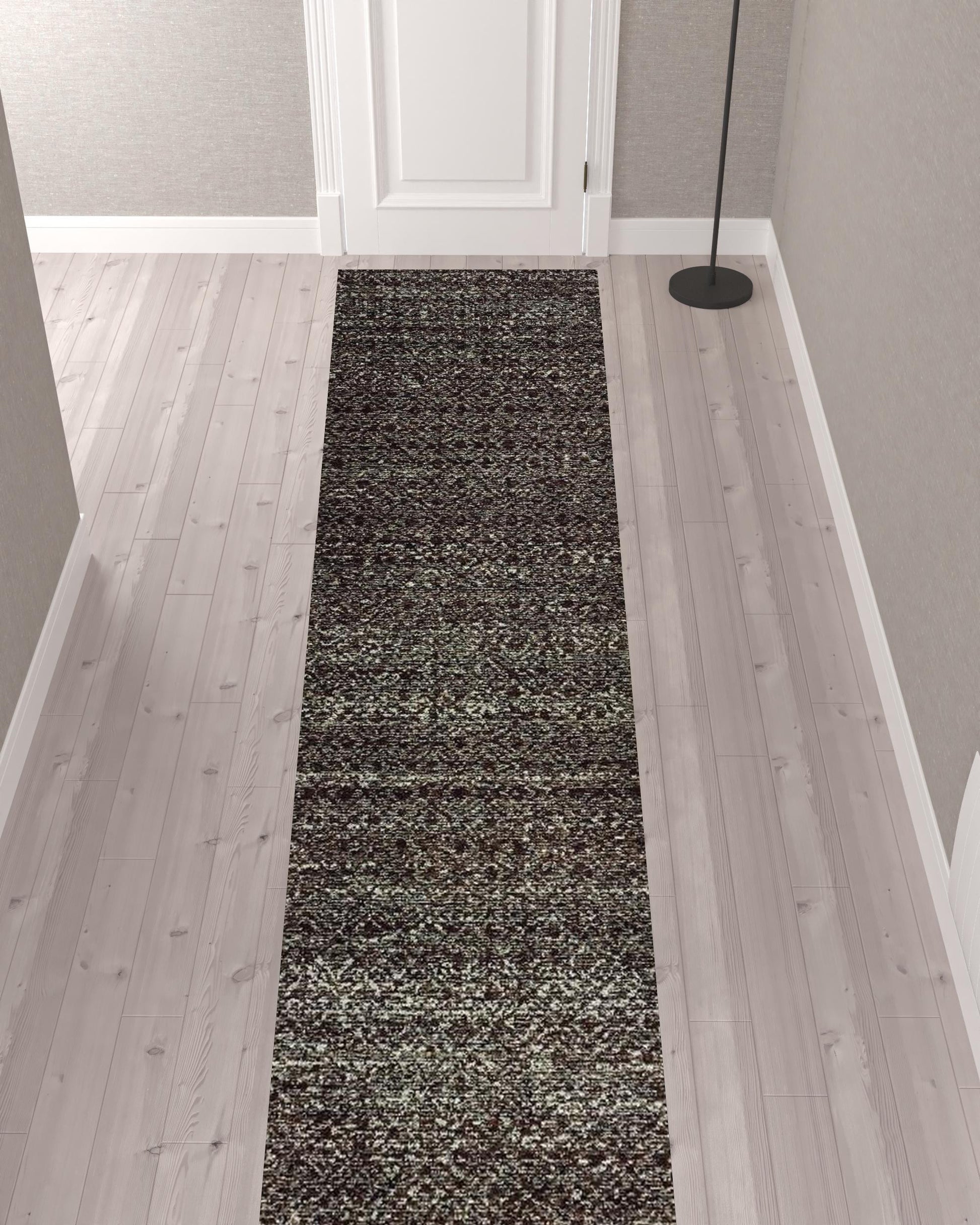 This 2' x 10' charcoal grey and brown geometric power loom stain resistant runner rug, is a great way to add warmth to a room. This runner shaped rug features a geometric design in charcoal grey and brown to give it visual interest. A classic shape marries with good looking design for your space Ideal for spaces with kids and pets, this rug is stain resistant to help repel stains and spilled liquids. Area Rugs help to give warmth and sense of home to your space. 0.55" H x 29.92" W x 143.7" D