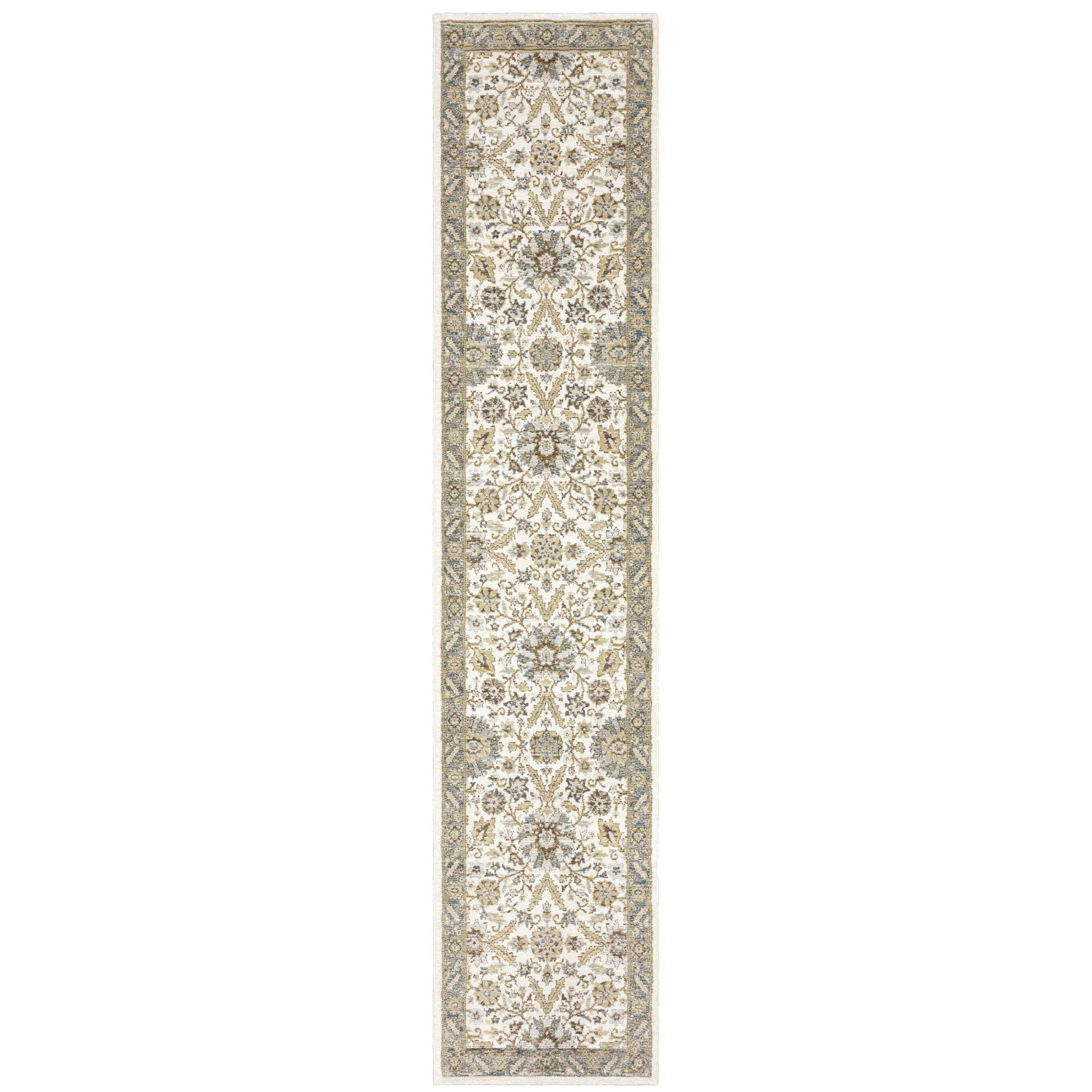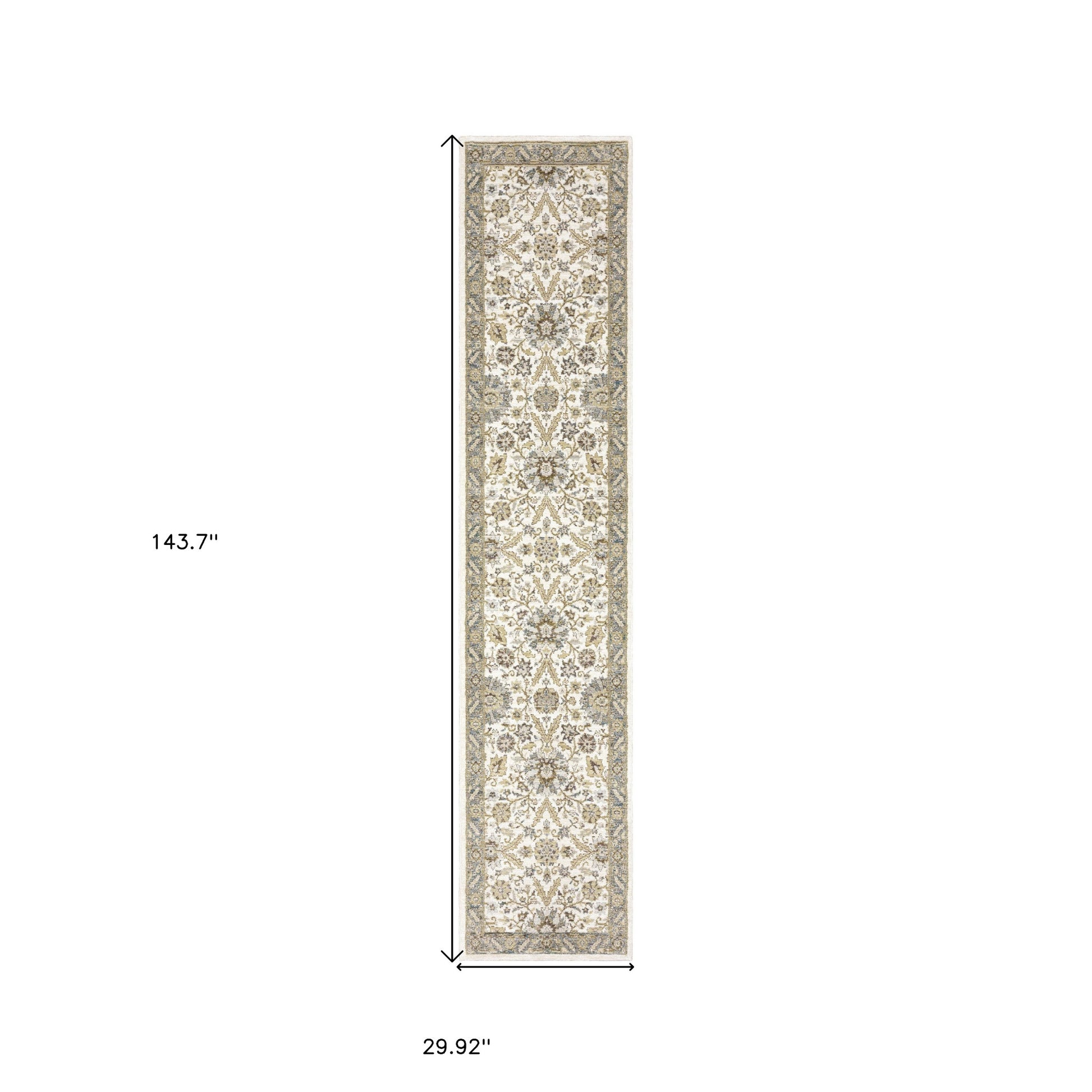This 2' x 10' gray and ivory oriental power loom runner rug, is a great way to add warmth to a room. This runner shaped rug features a oriental design in gray and ivory to give it visual interest. A classic shape marries with good looking design for your space Ideal for spaces with kids and pets, this rug is stain resistant to help repel stains and spilled liquids. Place this area rug against a hardwood or tile floor and it will enliven your living space with style and sophistication. 0.55" H x 29.92" W x 143.7" D