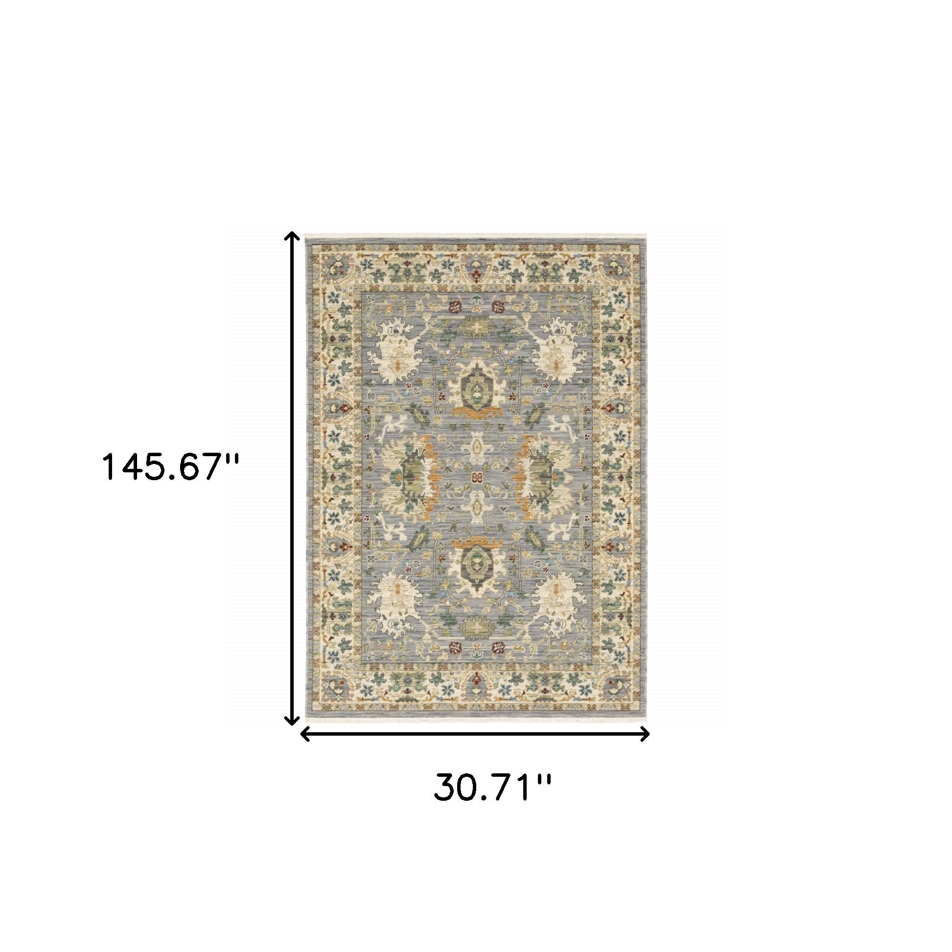 Add great coloration and comfortable texture to your space with this 2' x 10' gray and ivory oriental power loom runner rug with fringe. This runner shaped rug features a oriental design in gray and ivory to give it visual interest. A classic shape marries with good looking design for your space Ideal for spaces with kids and pets, this rug is stain resistant to help repel stains and spilled liquids. Tassel ends bring a timeless and fashionable look to your interior. Place this area rug against a hardwood or tile floor and it will enliven your living space with style and sophistication. 0.31" H x 30.71" W x 145.67" D