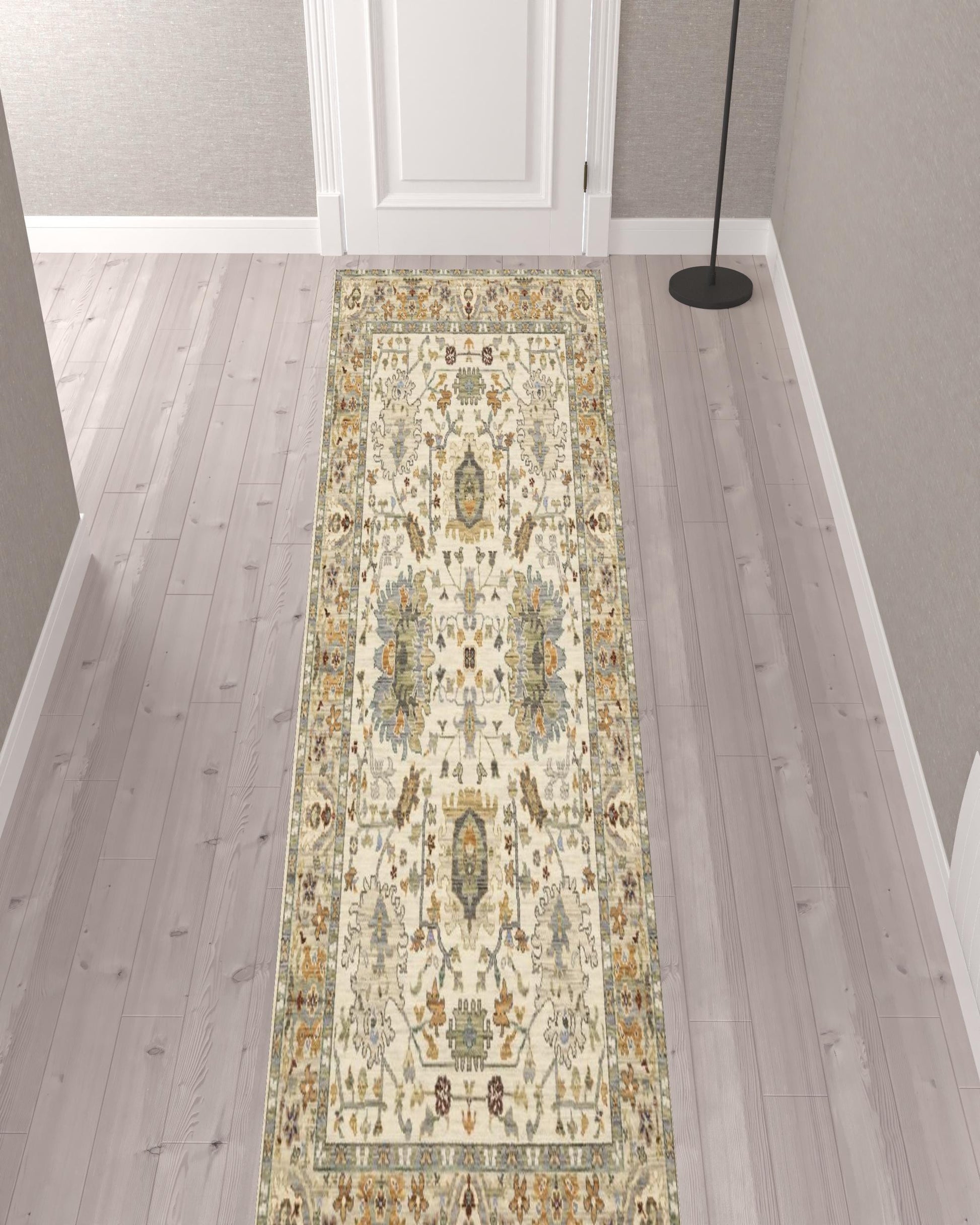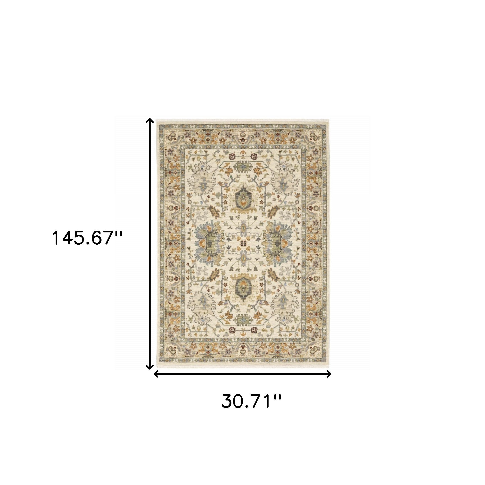 Add some artistry to your room with this 2' x 10' gray and ivory oriental power loom runner rug with fringe. This runner shaped rug features a oriental design in gray and ivory to give it visual interest. A classic shape marries with good looking design for your space Ideal for spaces with kids and pets, this rug is stain resistant to help repel stains and spilled liquids. Tassel ends bring a timeless and fashionable look to your interior. Place this area rug against a hardwood or tile floor and it will enliven your living space with style and sophistication. 0.31" H x 30.71" W x 145.67" D