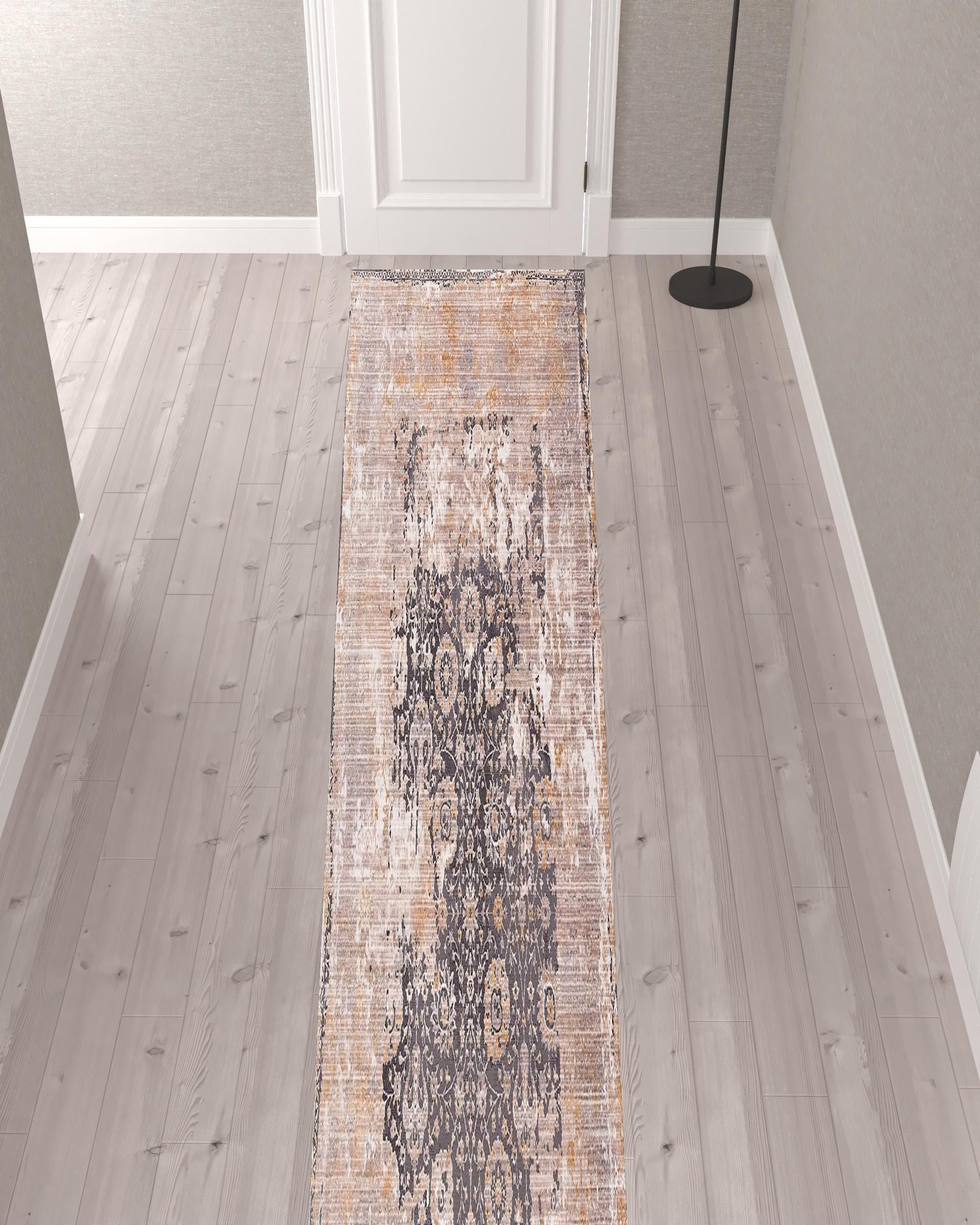 Uniquely designed to draw the eyes, this Gray Washed Out Persian Runner Rug is packed with warm tones in a modern approach to spruce up your living room. Flanking the Persian patterns in the center over a deep gray-toned base surrounded by saturated hues in a bleached-out fashion to accentuate a vintage vibe for visual intrigue. This Turkish-made rug is masterfully crafted with a fusion of polyester and cotton, making it highly durable against indoor elements while being able to retain the exotic color for a long time without losing its shape and shine. The plush pile offers a luxurious surface texture for a cozy feel under the feet, making it an excellent choice for your living room, bedroom, or dining area. Transform the look of your hardwood floors with this stunning runner rug that is meant to complement any transitional or bohemian abode. 120” x 27” x 0.6”