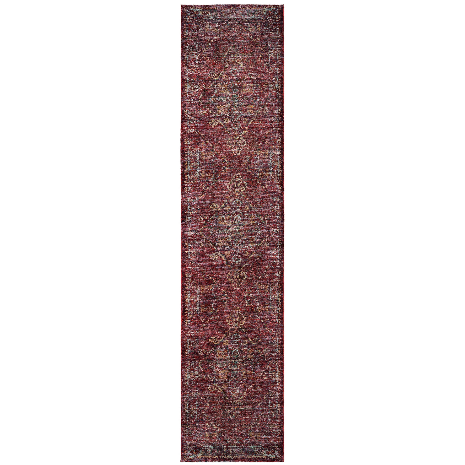 Add great coloration and comfortable texture to your space with this 2' x 10' red and gold oriental power loom stain resistant runner rug. This runner shaped rug features a oriental design in red and gold to give it visual interest. A classic shape marries with good looking design for your space Ideal for spaces with kids and pets, this rug is stain resistant to help repel stains and spilled liquids. Area Rugs help to give warmth and sense of home to your space. 0.55" H x 29.92" W x 143.7" D