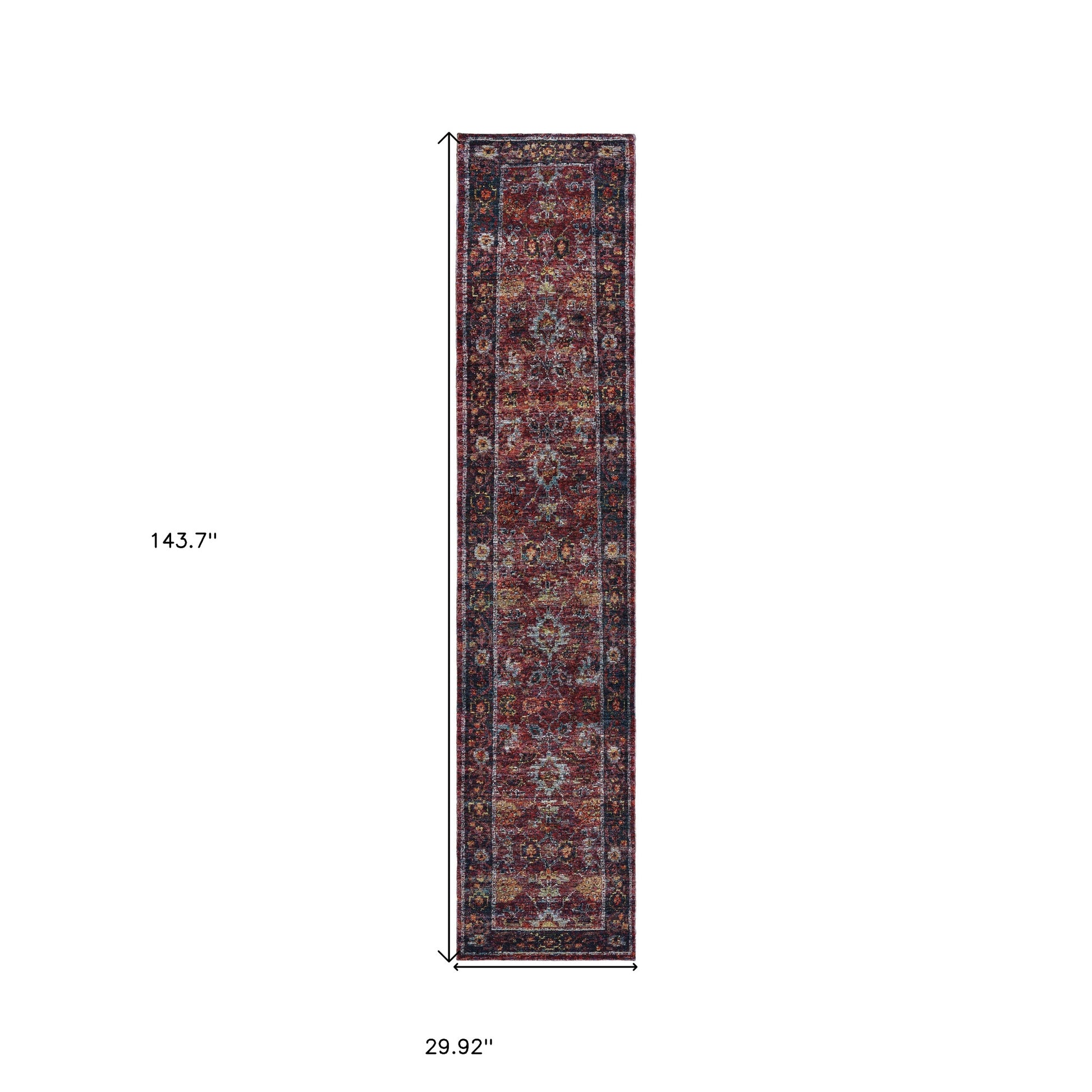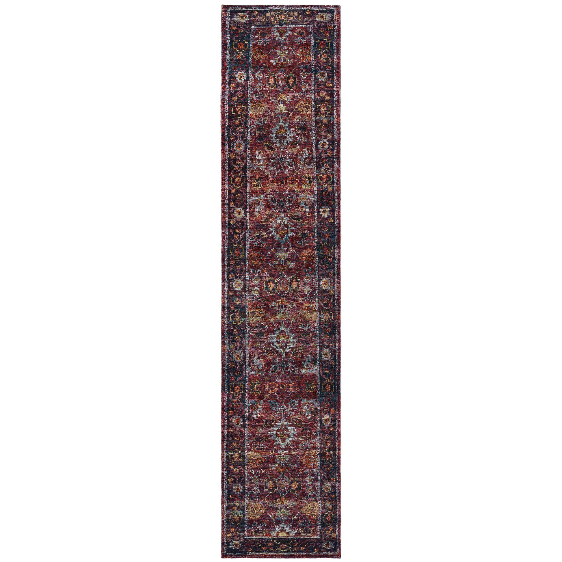 Set an inviting tone in your space with this 2' x 10' red purple gold and grey oriental power loom stain resistant runner rug. This runner shaped rug features a oriental design in red purple gold and grey to give it visual interest. A classic shape marries with good looking design for your space Ideal for spaces with kids and pets, this rug is stain resistant to help repel stains and spilled liquids. Place this area rug against a hardwood or tile floor and it will enliven your living space with style and sophistication. 0.55" H x 29.92" W x 143.7" D