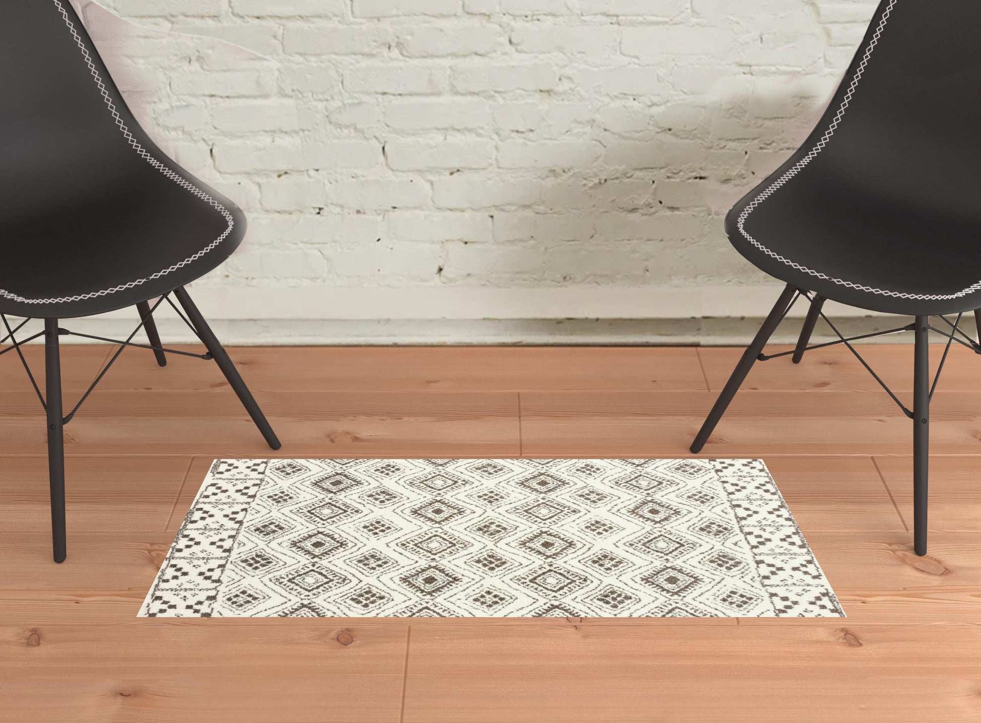 2' X 3' Ivory And Brown Geometric Shag Power Loom Stain Resistant Area Rug