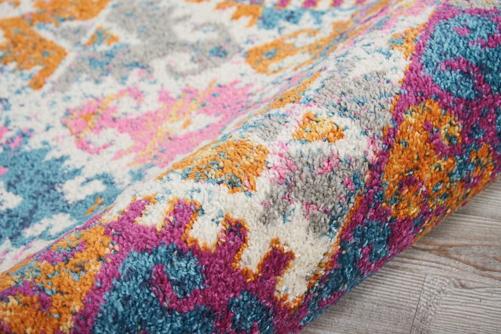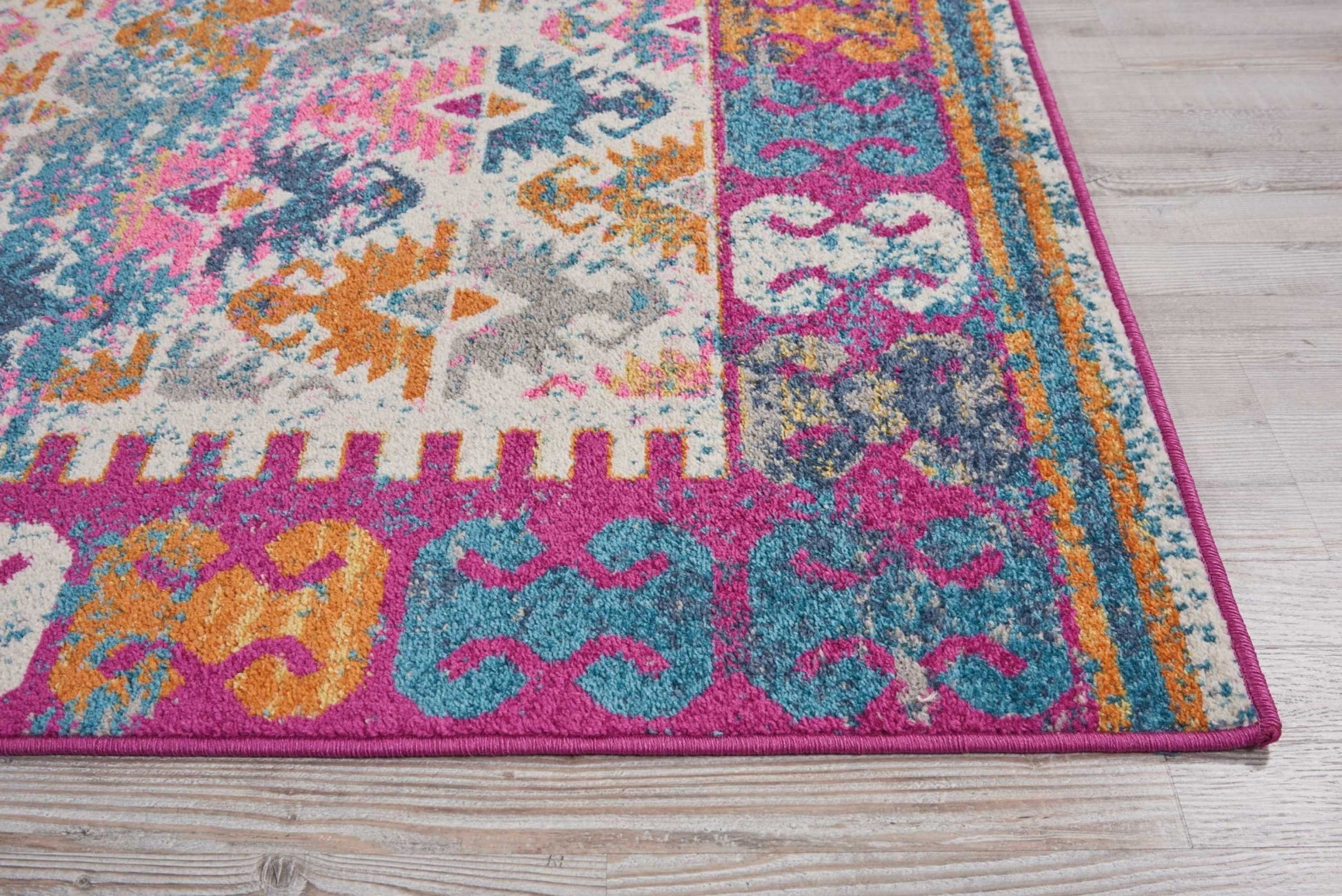 Express your affinity for tribal aesthetics and culture with this beautiful Ivory and Magenta Tribal Pattern Scatter Rug that is both colorful and elegant. The unique tribal patterns come to life with its vibrant use of fuchsia, saffron, gold, and teal on ivory giving it versatility as a primary decorative piece. The strong borders and deep color scheme makes it suitable for traditional, contemporary, and bohemian setups. Made in Turkey, the brilliant print of this rug will last for ages due to the use of high-quality soft 100% polypropylene and advanced power loom construction. Besides being easy to care and maintain, this rug is considerably stain-resistant to stand up to the messes and scratches of indoor areas with medium foot traffic. The saturated hues and traditional patterns of this scatter rug will induce an adventurous and culturally progressive atmosphere in your living space. 22" x 34"