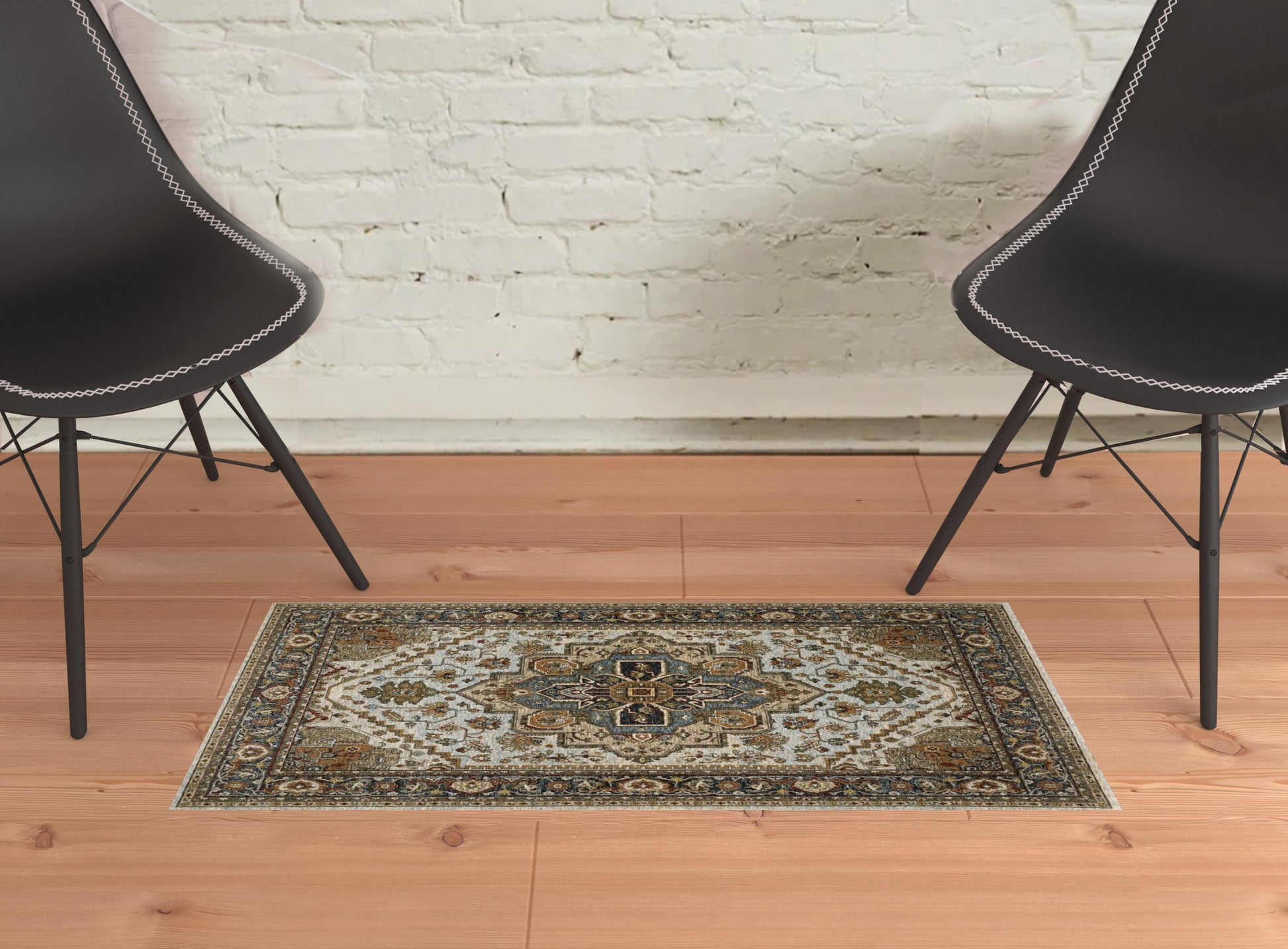 Set an inviting tone in your space with this 2' x 3' ivory beige blue orange gold green grey and rust oriental power loom stain resistant area rug with fringe. This rectangle shaped rug features a oriental design in ivory beige blue orange gold green grey and rust to give it visual interest. A classic shape marries with good looking design for your space Ideal for spaces with kids and pets, this rug is stain resistant to help repel stains and spilled liquids. Tassel ends bring a timeless and fashionable look to your interior. Area Rugs help to give warmth and sense of home to your space. 0.24" H x 23.62" W x 36.22" D
