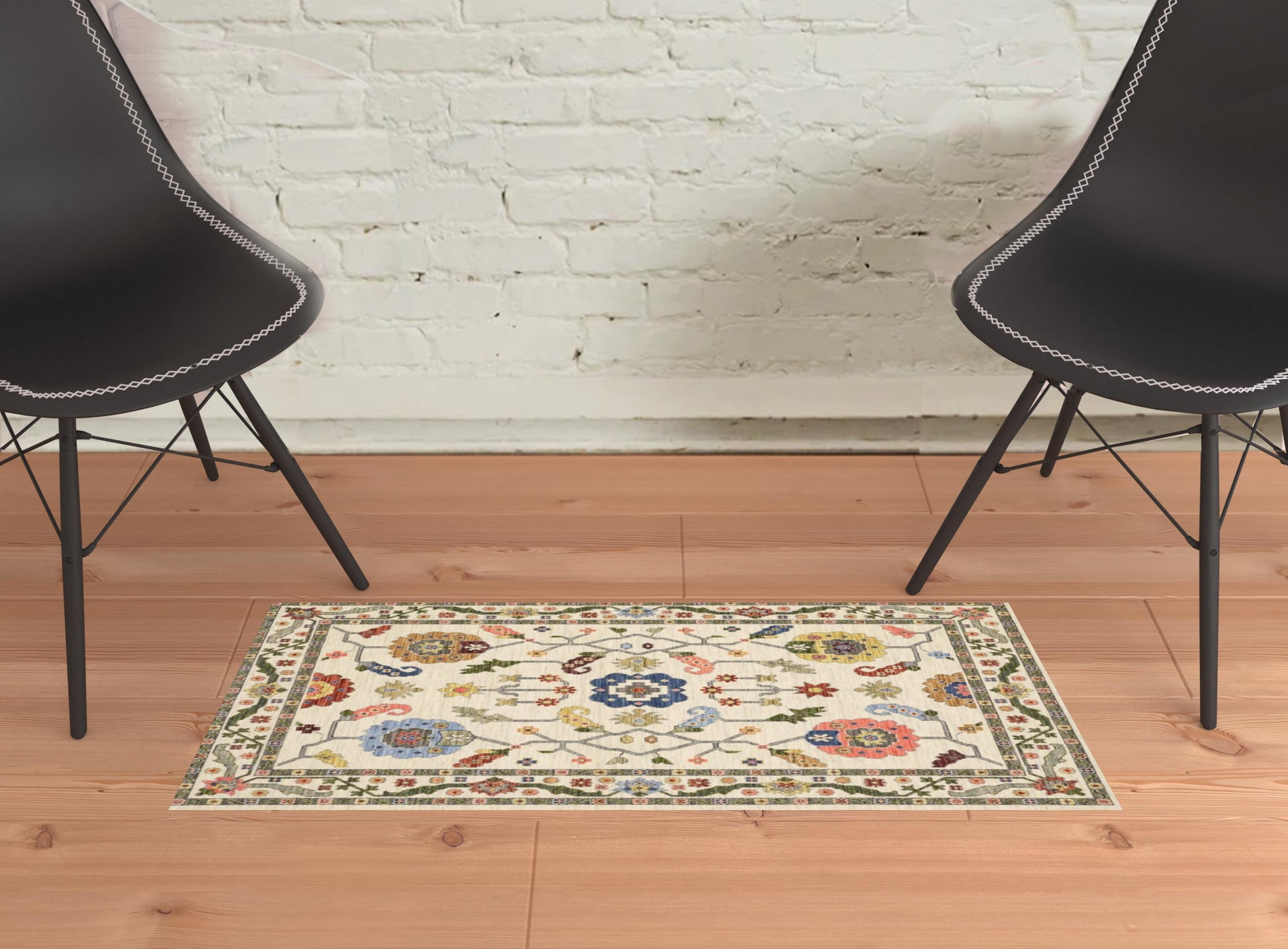 Add some artistry to your room with this 2' x 3' ivory green blues pink yellow rust brown tan and grey oriental power loom stain resistant area rug with fringe. This rectangle shaped rug features a oriental design in ivory green blues pink yellow rust brown tan and grey to give it visual interest. A classic shape marries with good looking design for your space Ideal for spaces with kids and pets, this rug is stain resistant to help repel stains and spilled liquids. Tassel ends bring a timeless and fashionable look to your interior. Area Rugs help to give warmth and sense of home to your space. 0.31" H x 23.62" W x 36.22" D