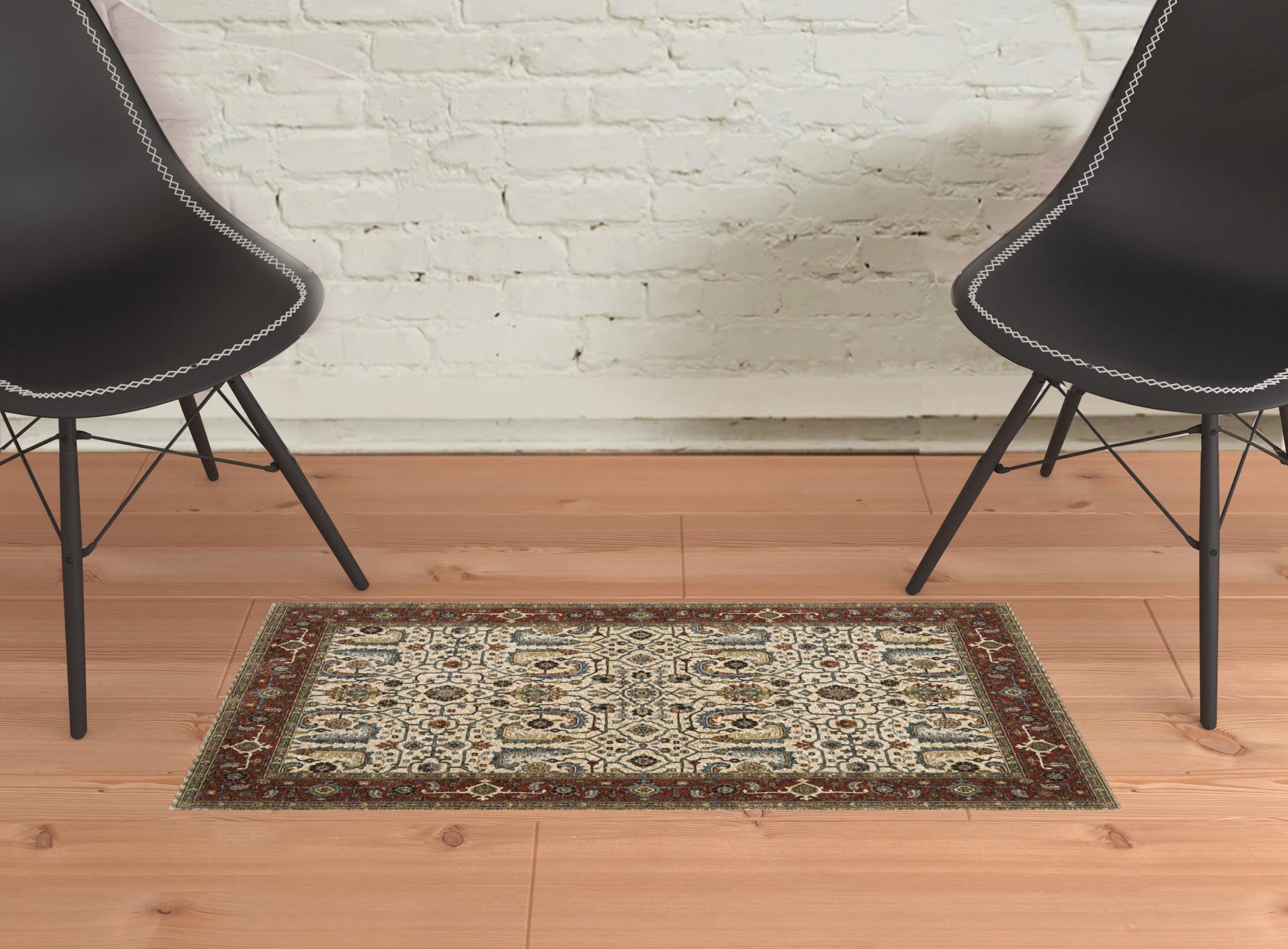 2' X 3' Ivory Red Green Grey Blue And Navy Oriental Power Loom Stain Resistant Area Rug With Fringe