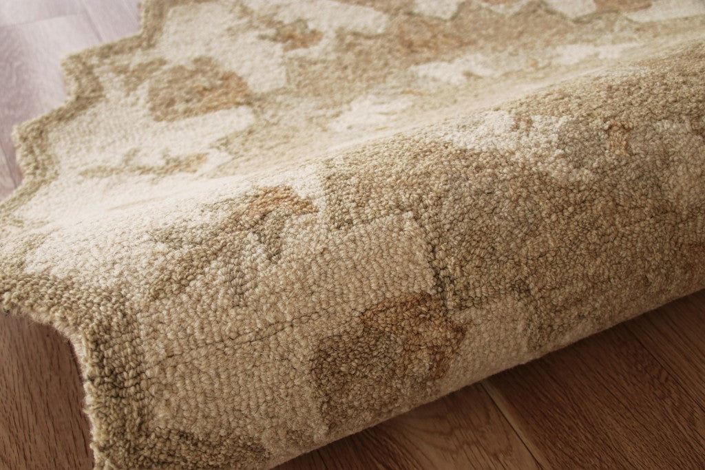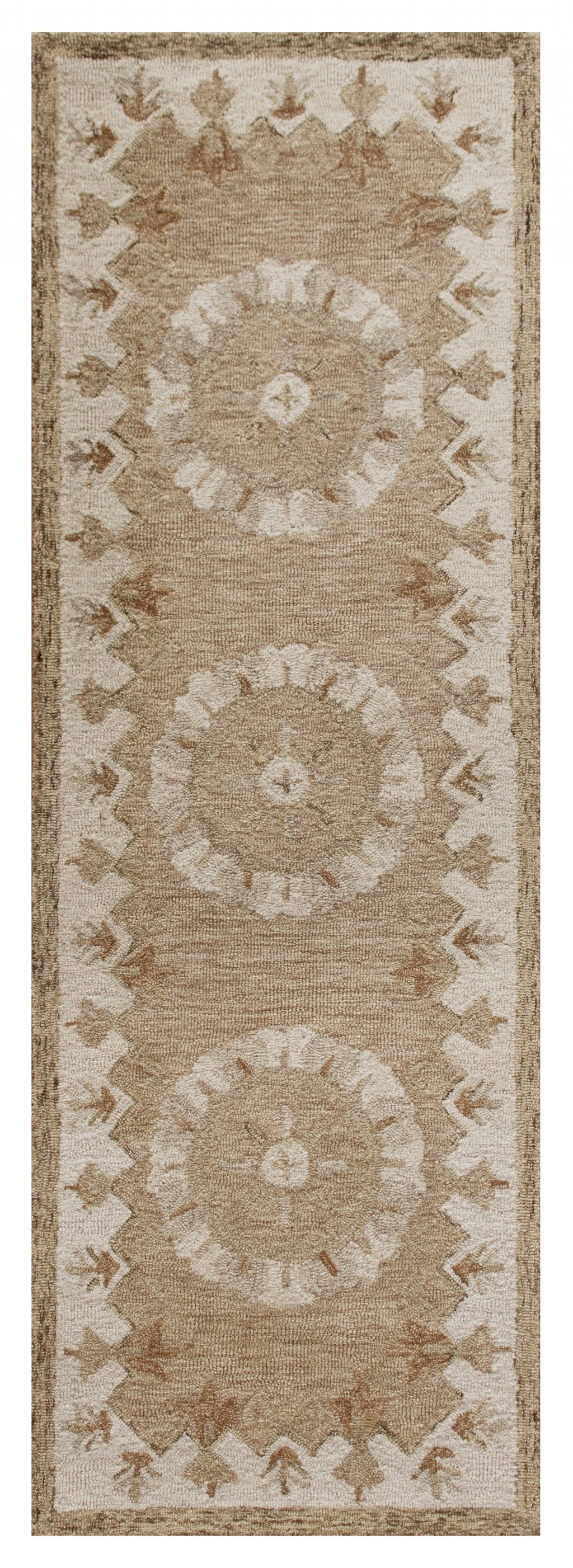 Bring a sense of refined luxury with this Tan Retro Modern Medallion Runner Rug that accentuates a neutral palette to spruce up the area in front of a fireplace. Beautifully designed with intricate floral medallions in tan and a thick border around the edges flaunted on a beige backdrop to create visual interest. Crafted with 100% wool to ensure strength and durability to stand up to the elements of indoor areas with high foot traffic and resist stains to maintain the pristine look. The soft and moderate pile construction adds to the surface texture that feels luxurious on the touch. Upholding traditional patterns with soft hues, this runner rug will be a classy accent to roll on the floor. 27” x 81” x 0.5”