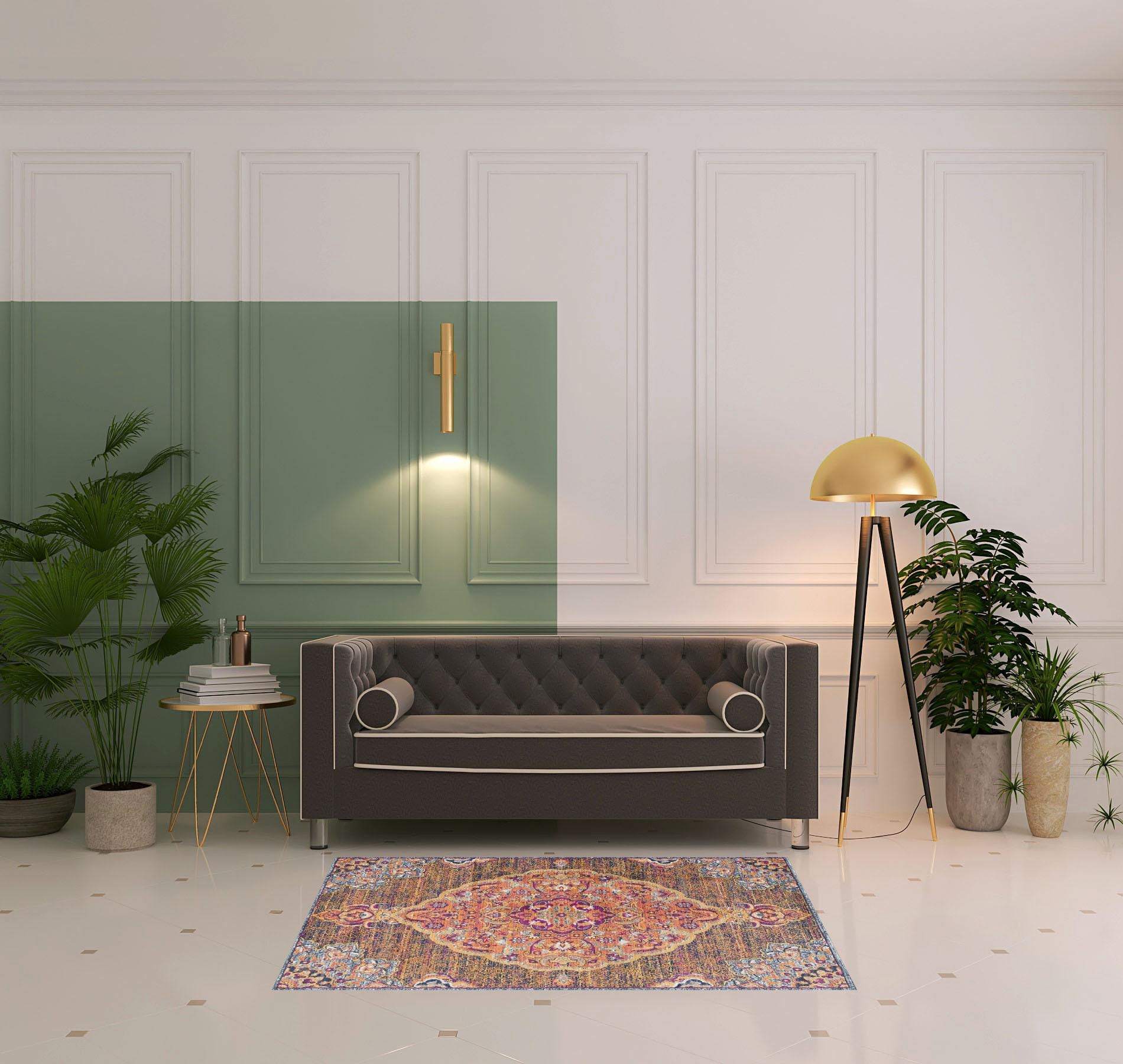 Encouraging an essence of rich traditional styling, this Rustic Orange Medallion Area Rug exhibits a blend of saturated hues to uphold a sense of extravagance into your living space. The exaggerated medallion in the center is intricately decorated with rustic orange, gold, magenta, and tints of blue on a multi-toned base for visual harmony. Ideal for indoor areas with heavy foot traffic, this rug is made in Turkey with 100% polypropylene that speaks of its durability and stain resistance to last long and retain its pristine look for ages. The low pile construction adds to a refined look offering a smooth surface texture with a lustrous effect that feels as luxurious as it looks. Flaunting warm-toned hues and traditional patterns, this alluring area rug will add a sense of energy and vibrance to your traditional home. 66” x 45” x 0.4”