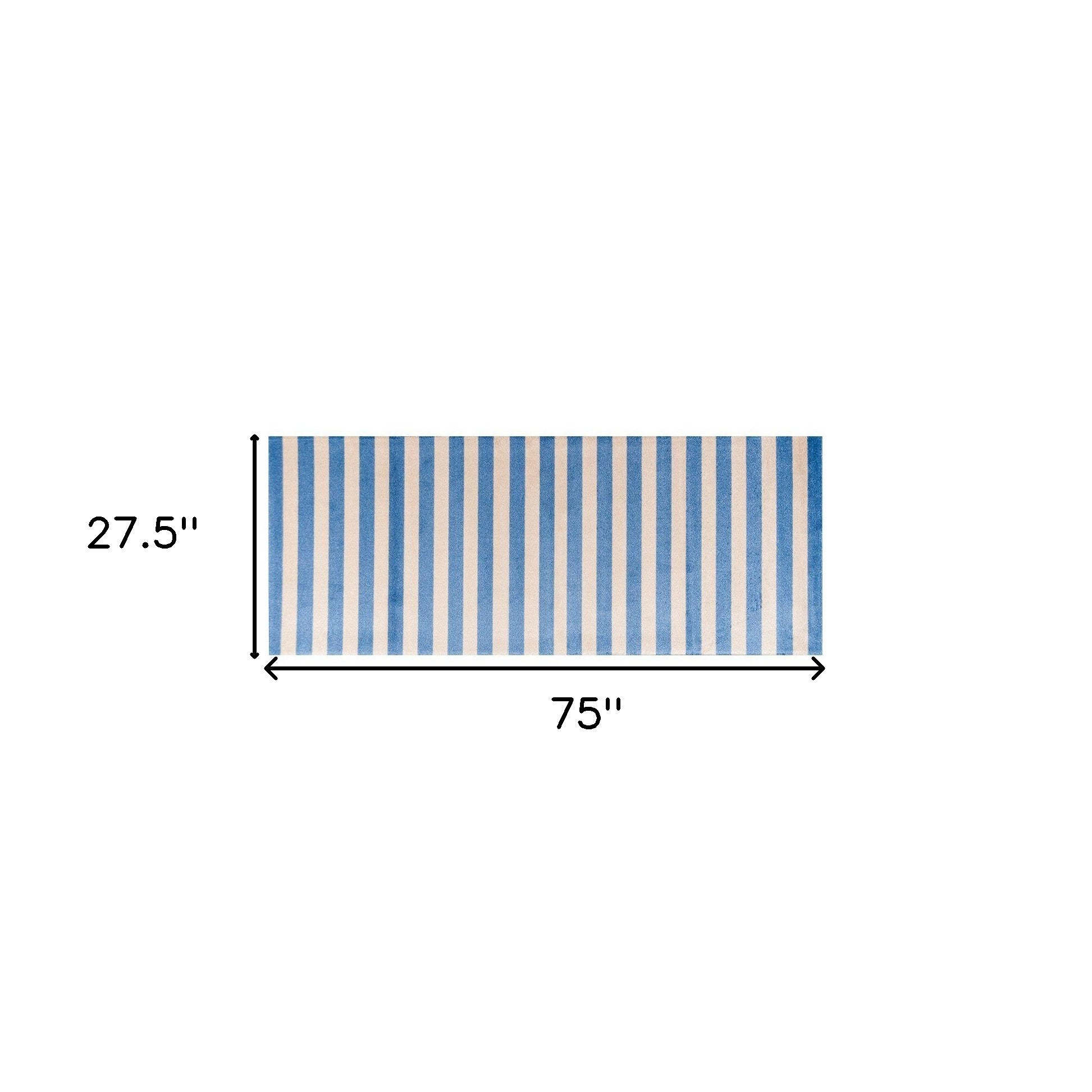 Set an inviting tone in your space with this 2' x 6' ocean blue and sand striped tufted washable non skid area rug. This rectangle shaped rug features a striped design in ocean blue and sand to give it visual interest. A classic shape marries with good looking design for your space Ideal for spaces with kids and pets, this rug is stain resistant to help repel stains and spilled liquids. Area Rugs help to give warmth and sense of home to your space. 0.25" H x 27.5" W x 75" D