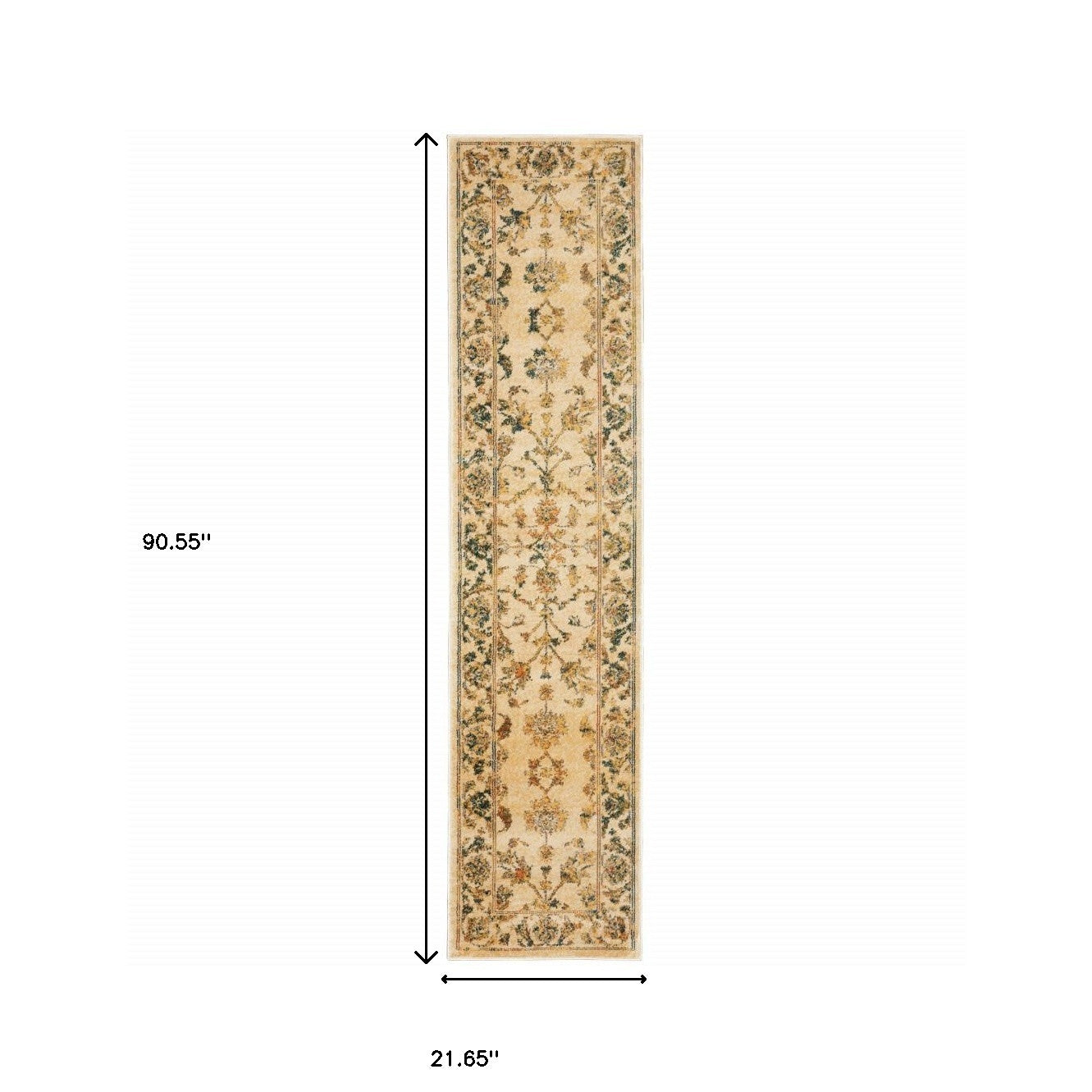 Add some artistry to your room with this 2' x 8' beige gold and teal oriental power loom stain resistant runner rug. This runner shaped rug features a oriental design in beige gold and teal to give it visual interest. A classic shape marries with good looking design for your space Ideal for spaces with kids and pets, this rug is stain resistant to help repel stains and spilled liquids. Place this area rug against a hardwood or tile floor and it will enliven your living space with style and sophistication. 0.23" H x 21.65" W x 90.55" D