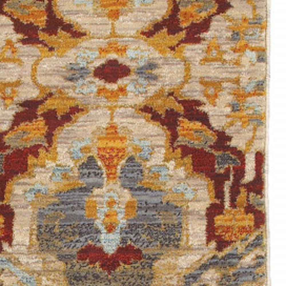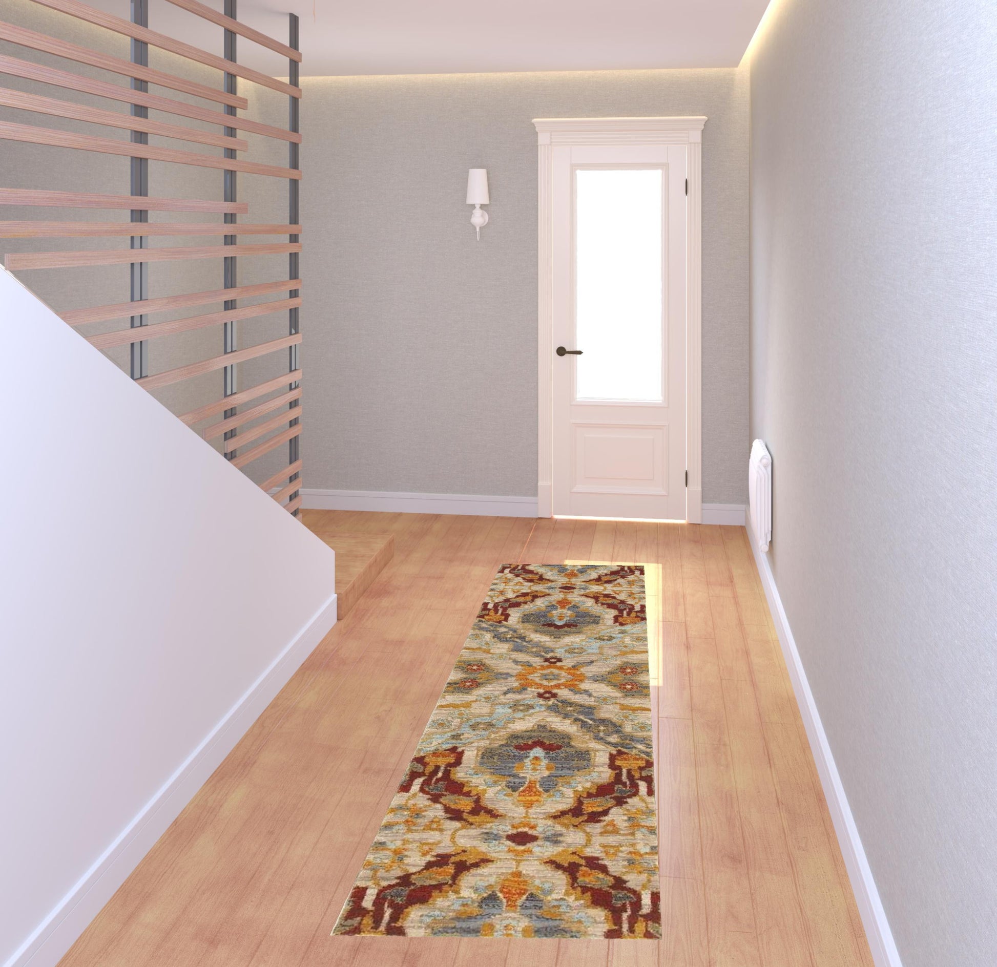 This 2' x 8' beige orange blue gold and grey abstract power loom stain resistant runner rug, is a great way to add warmth to a room. This runner shaped rug features a abstract design in beige orange blue gold and grey to give it visual interest. A classic shape marries with good looking design for your space Ideal for spaces with kids and pets, this rug is stain resistant to help repel stains and spilled liquids. Place this area rug against a hardwood or tile floor and it will enliven your living space with style and sophistication. 0.39" H x 26.77" W x 90.55" D