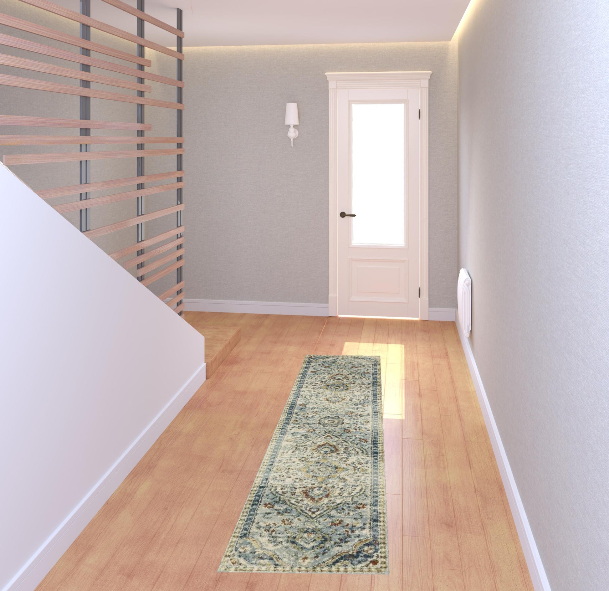 Add some artistry to your room with this 2' x 8' blue beige rust gold and teal oriental power loom stain resistant runner rug. This runner shaped rug features a oriental design in blue beige rust gold and teal to give it visual interest. A classic shape marries with good looking design for your space Ideal for spaces with kids and pets, this rug is stain resistant to help repel stains and spilled liquids. Area Rugs help to give warmth and sense of home to your space. 0.39" H x 22.83" W x 86.61" D