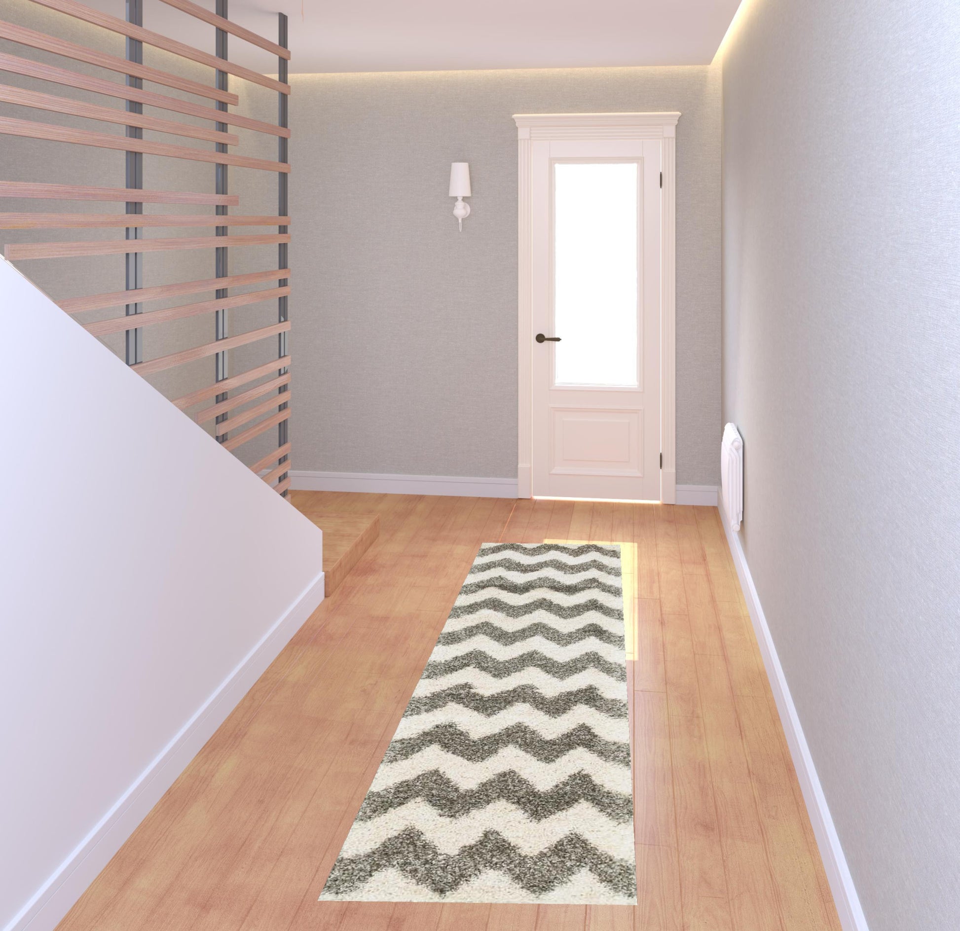 This 2' x 8' grey and ivory geometric shag power loom stain resistant runner rug, is a great way to add warmth to a room. This runner shaped rug features a geometric design in grey and ivory to give it visual interest. A classic shape marries with good looking design for your space Ideal for spaces with kids and pets, this rug is stain resistant to help repel stains and spilled liquids. The retro shag construction of this luxurious rug will provide a soft and comfortable barrier to color tile and hardwood floors. Place this area rug against a hardwood or tile floor and it will enliven your living space with style and sophistication. 1.96" H x 26.77" W x 90.55" D