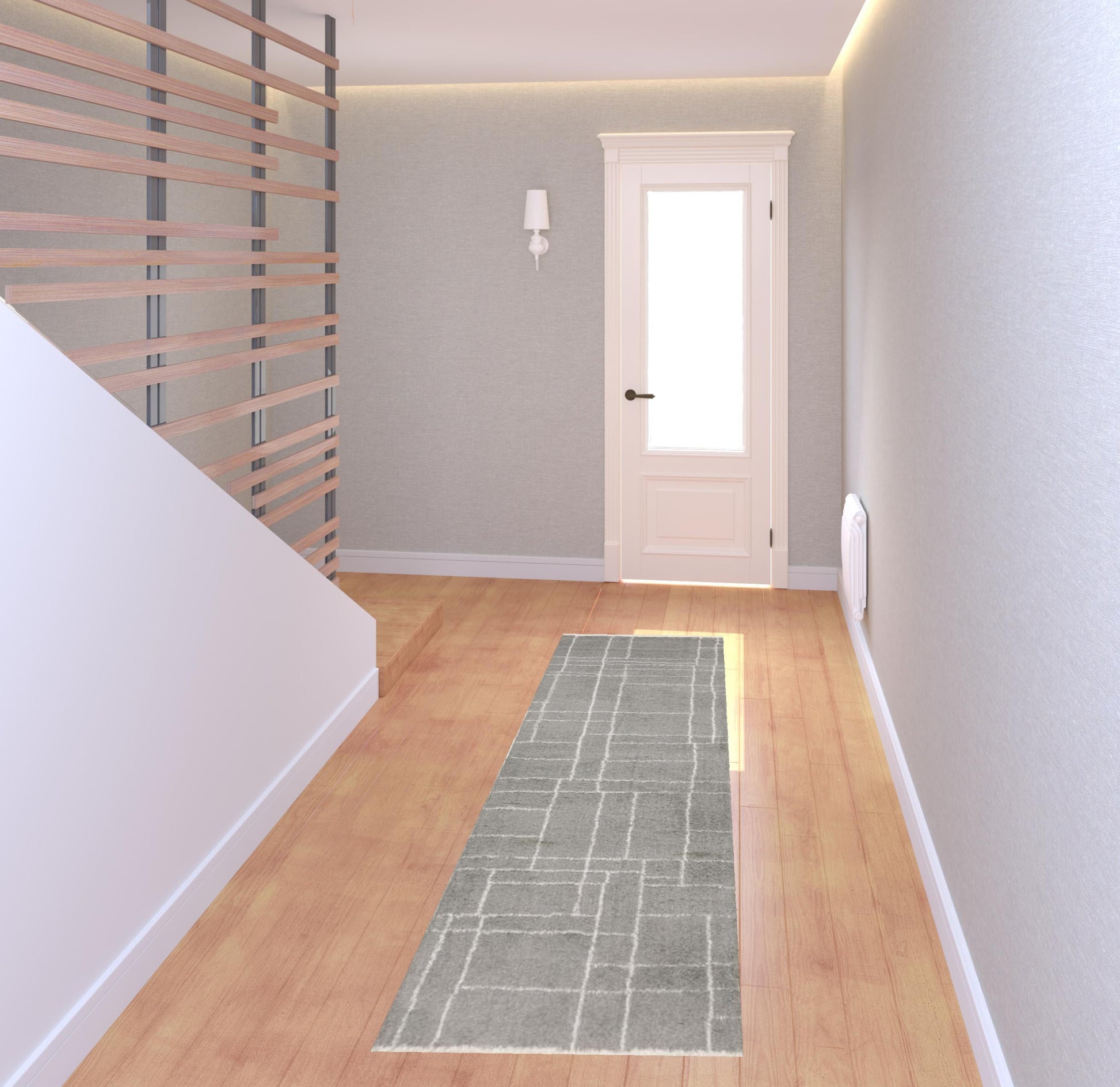 This 2' x 8' grey and ivory geometric shag power loom stain resistant runner rug, is a great way to add warmth to a room. This runner shaped rug features a geometric design in grey and ivory to give it visual interest. A classic shape marries with good looking design for your space Ideal for spaces with kids and pets, this rug is stain resistant to help repel stains and spilled liquids. The retro shag construction of this luxurious rug will provide a soft and comfortable barrier to color tile and hardwood floors. Place this area rug against a hardwood or tile floor and it will enliven your living space with style and sophistication. 0.98" H x 26.77" W x 90.55" D