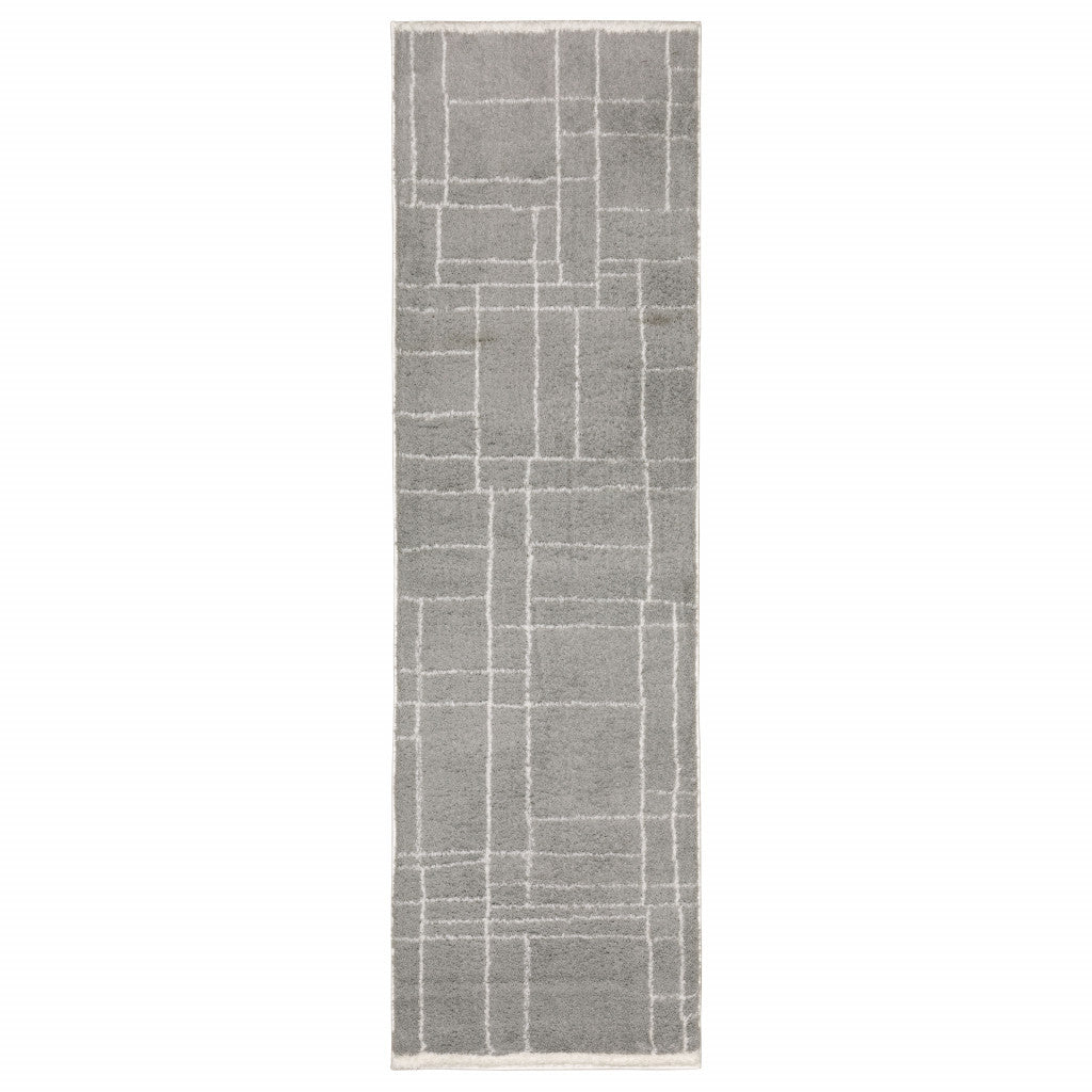 2' X 8' Grey And Ivory Geometric Shag Power Loom Stain Resistant Runner Rug