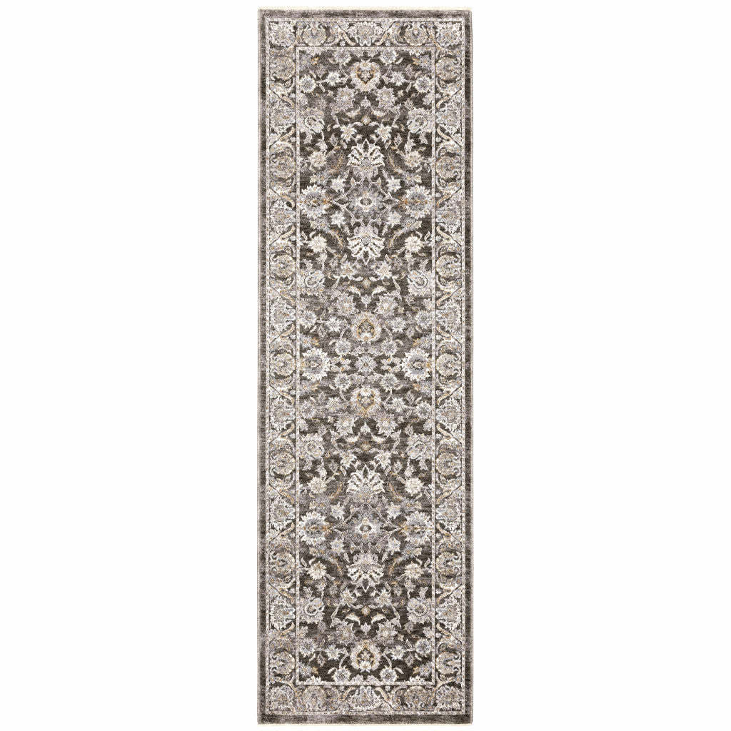 2' X 8' Grey And Ivory Oriental Power Loom Stain Resistant Runner Rug With Fringe